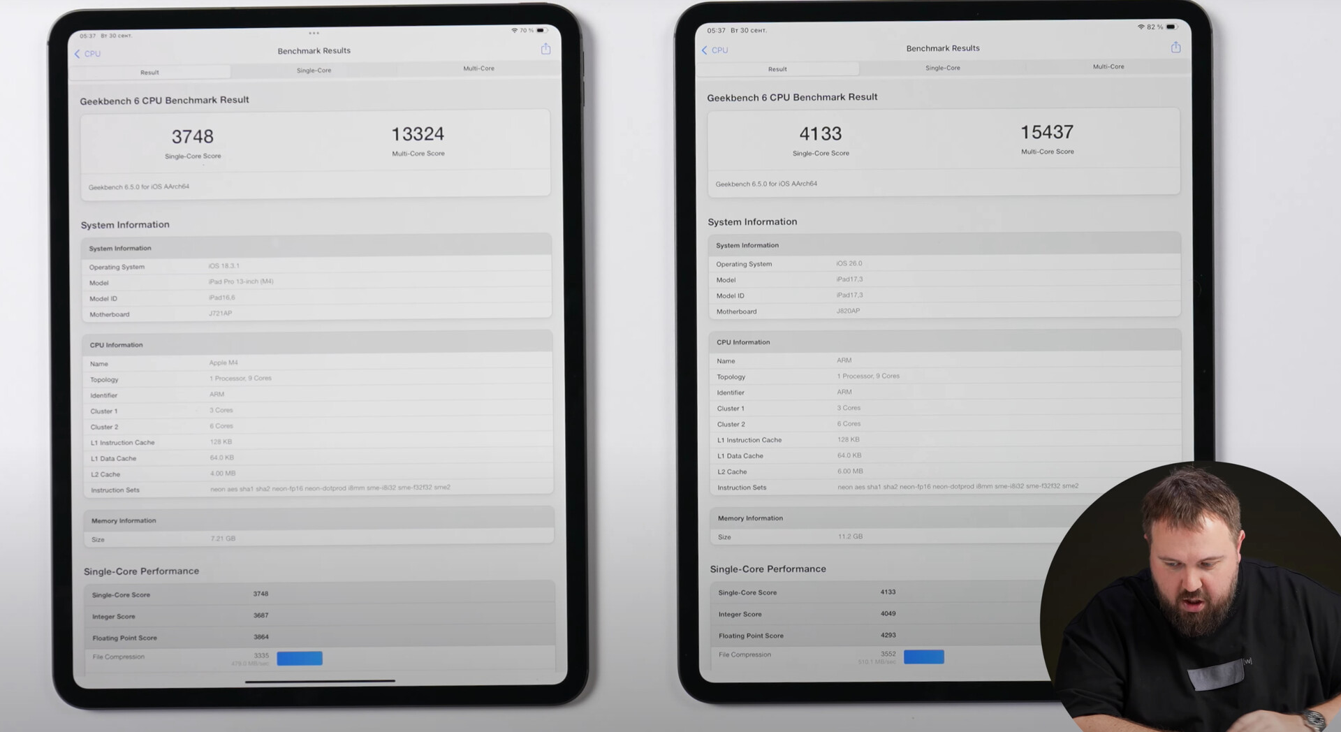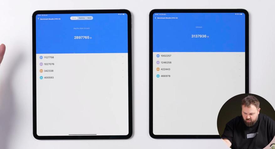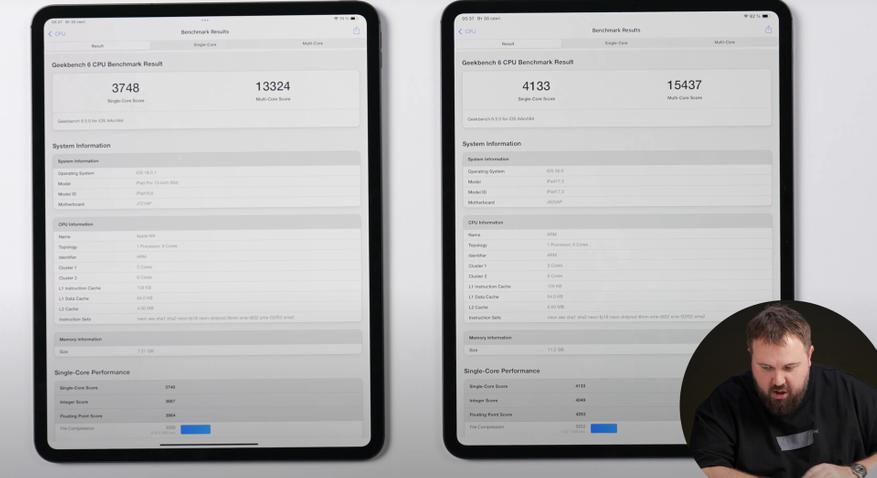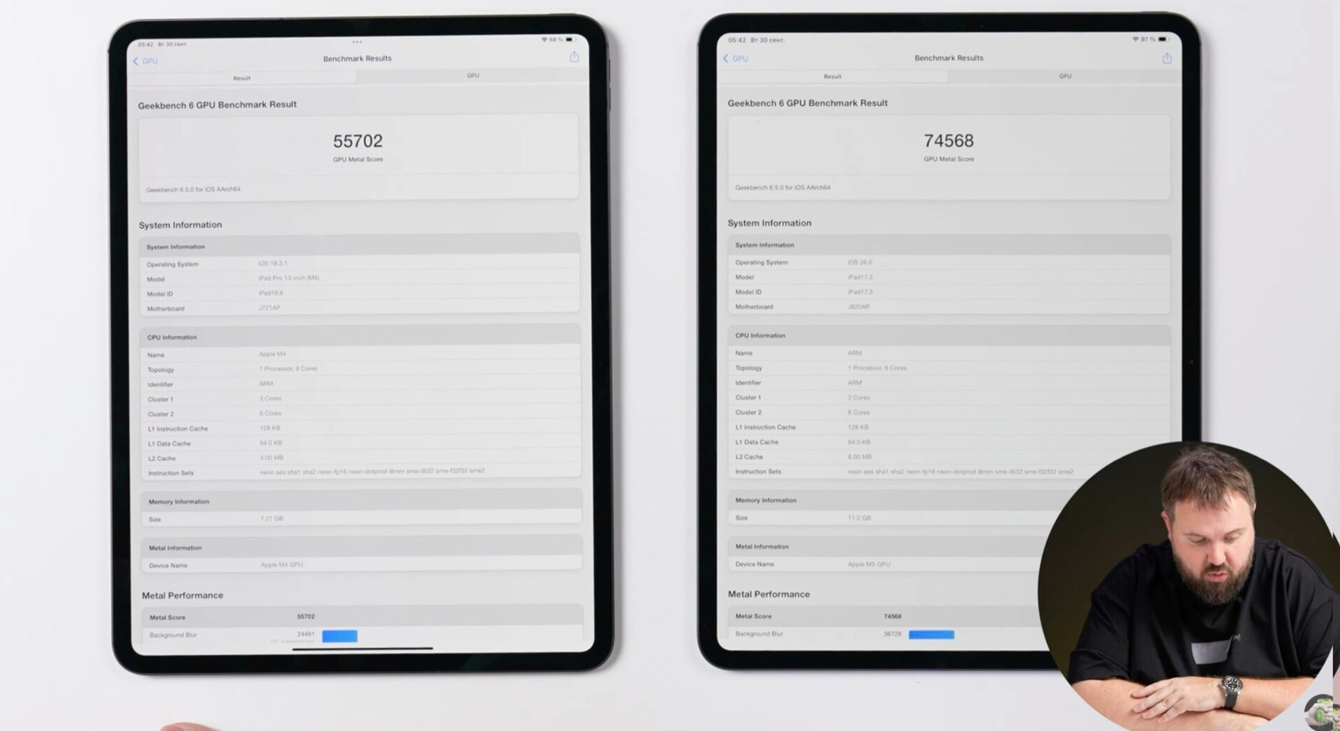 Производительность нового чипа превосходит предшественника: в одноядерном тесте Geekbench 6 результат выше на 10%, а в многоядерном — на 16%. Благодаря увеличенному на 50% объему кэш-памяти второго уровня, iPad Pro 13 с M5 показывает прирост в 8% в бенчмарке AnTuTu v10. Наиболее впечатляющий рост наблюдается в графических тестах — результаты Geekbench 6 Metal улучшились на 34%.