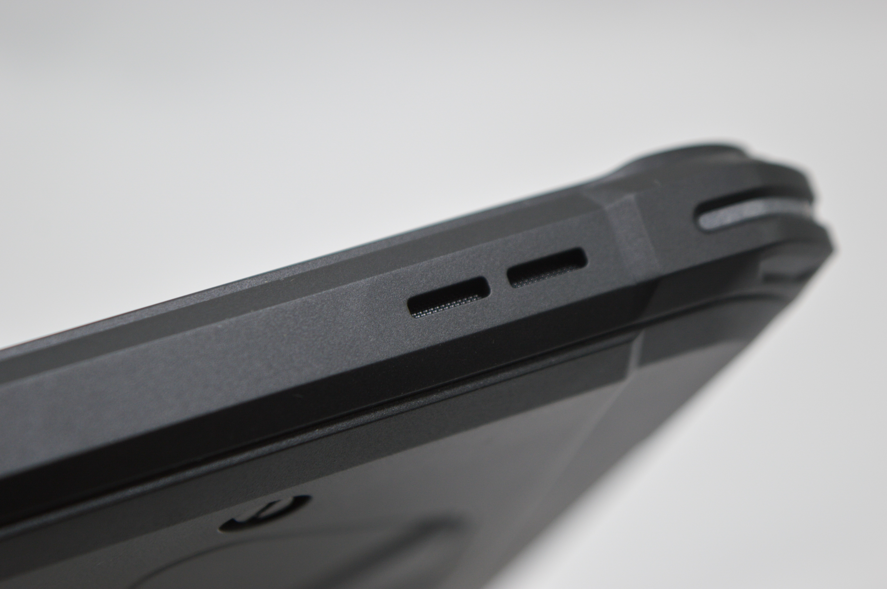 На коротких торцах планшета разместились динамики прикрытые сеткой, интерфейсы подключения прикрытые резиновыми заглушками, отверстие микрофона и кнопки управления