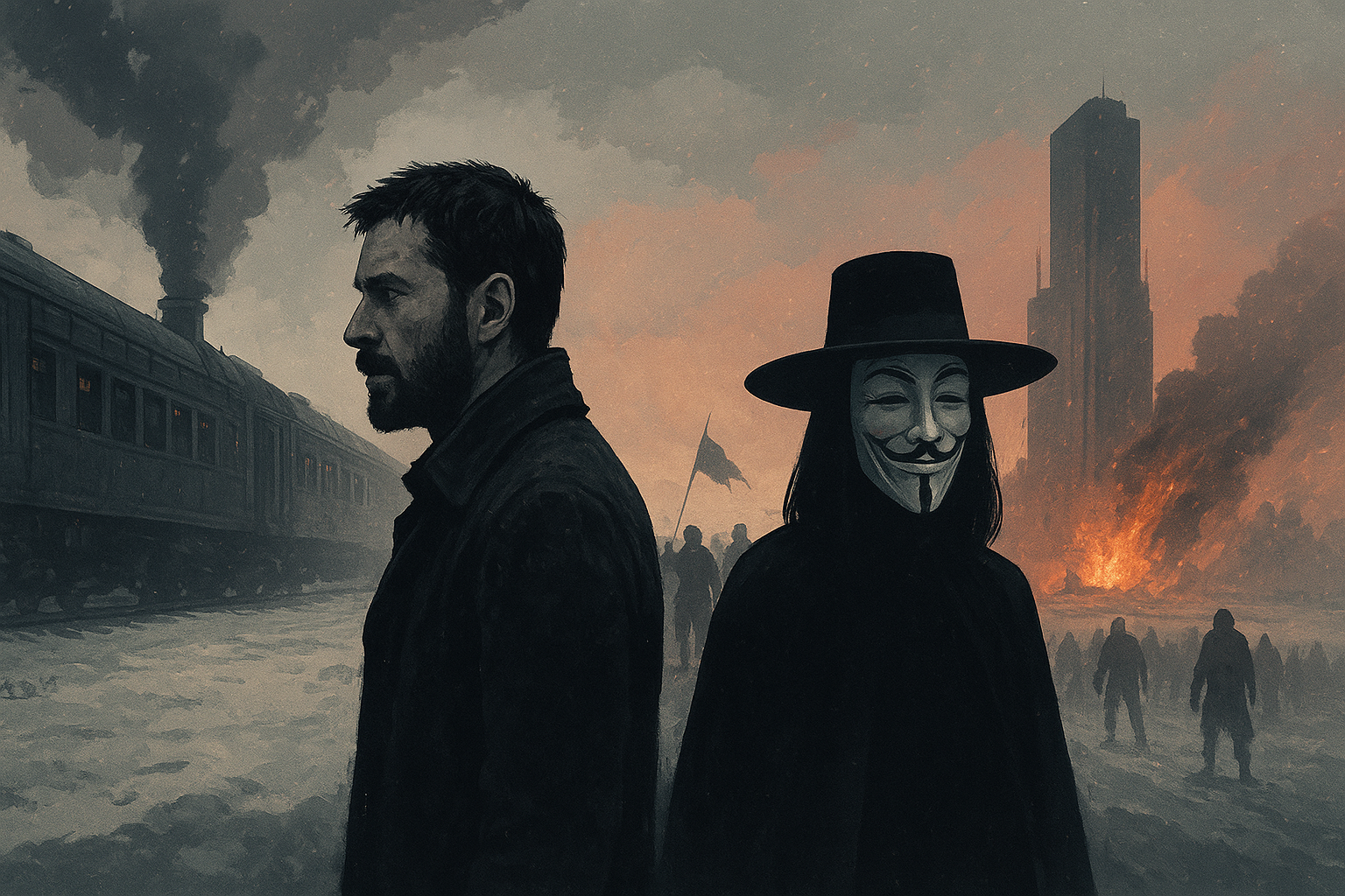 В эту атмосферу страха однажды врывается загадочная фигура — человек в маске Гая Фокса, известный лишь как V. Он одет как городской призрак революции: чёрный плащ, широкополая шляпа, маска с вечной улыбкой. Обладая невероятным интеллектом, харизмой и почти театральной манерой действовать, он начинает одиночную борьбу против режима.