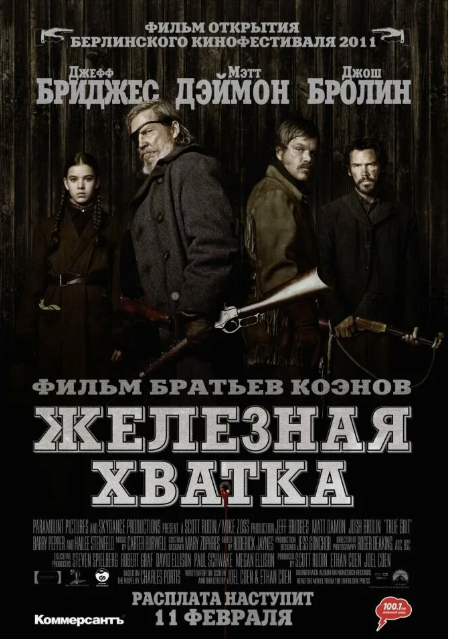 Великолепный вестерн, ставший самой кассовой работой Коэнов. Это история мести и стойкости, рассказанная через призму взросления. Четырнадцатилетняя Мэтти Росс, обладающая недюжинной решимостью и острым умом, нанимает уставшего от жизни и любящего выпить федерального маршала Рубана Когберна, чтобы найти убийцу своего отца. К ним присоединяется чопорный техасский рейнджер ЛаБиф, и это трио вынуждено терпеть друг друга в ходе опасного путешествия по диким землям. Фильм отличается безупречным визуальным стилем, острыми диалогами и блестящими актёрскими работами. Хейли Стейнфилд создала образ не по годам взрослой и целеустремлённой девочки, а Джефф Бриджес перевоплотился в грубоватого, но не лишённого кодекса чести маршала.