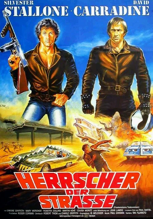 В антиутопическом будущем 2000 года самым популярным телешоу в Америке являются «Смертельные гонки» — трансконтинентальная автогонка, где пилоты получают очки не только за скорость, но и за сбитых пешеходов. Гонщик по прозвищу «Франкенштейн» — один из фаворитов безумных соревнований. Сильвестр Сталлоне в одной из своих ранних заметных ролей играет одного из гонщиков, соперничающих с главным героем. Фильм является сатирическим взглядом на медиа, насилие и культ знаменитостей в тоталитарном обществе.