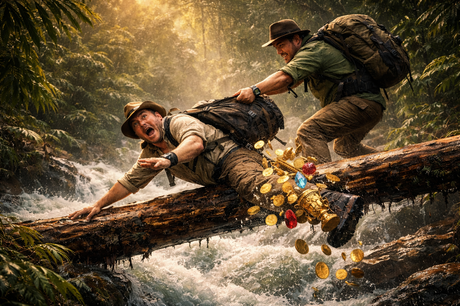 Фильм построен как классический приключенческий квест: тайники, загадки, предательства, погони и постоянное ощущение, что герои на шаг от провала. Юмор здесь рождается из конфликтов персонажей и их неумения доверять друг другу — ровно так же, как в «Джуманджи».