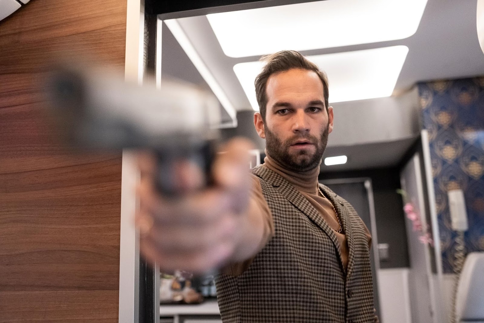 Киллер-танцор, пробравшийся зайцем профессионал, дамочка, будто сбежавшая из фильма про супергероев, — это лишь малая часть местной флоры и фауны. Да и второстепенных персонажей массовкой и не назвать. Каждый с набором странностей в сочетании, это всё превращает фильм в динамичный театр абсурда. В хорошем смысле. Юмор проявляется не только в словах, но и в действиях. Где еще можно увидеть, как наёмника вырубают ноутбуком в сопровождении звука выключения? А пилотов захваченного самолёта, которые вместо того, чтобы думать, что же делать в этой ситуации, обсуждают своё будущее и гонорар за проданную для сценария историю? Даже заключительная сцена фильма стебётся. Только уже над зрителями.