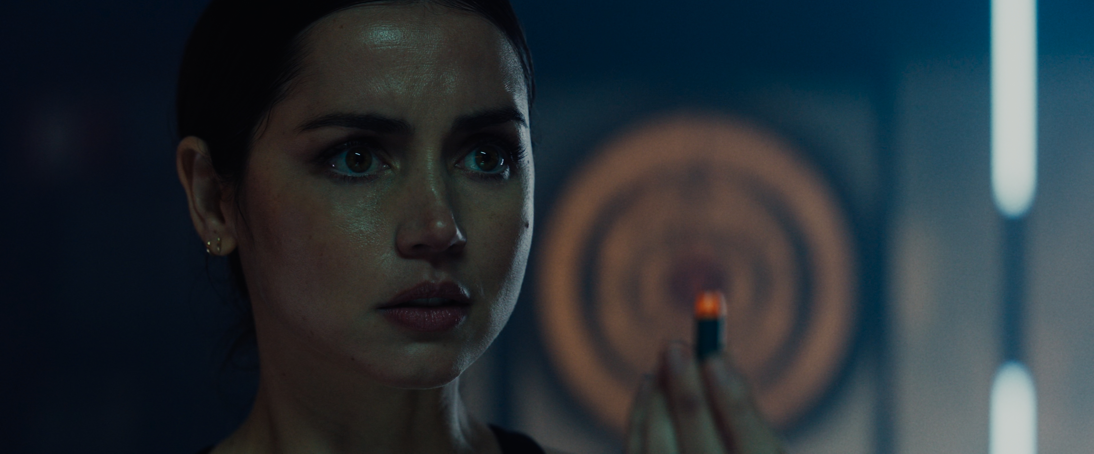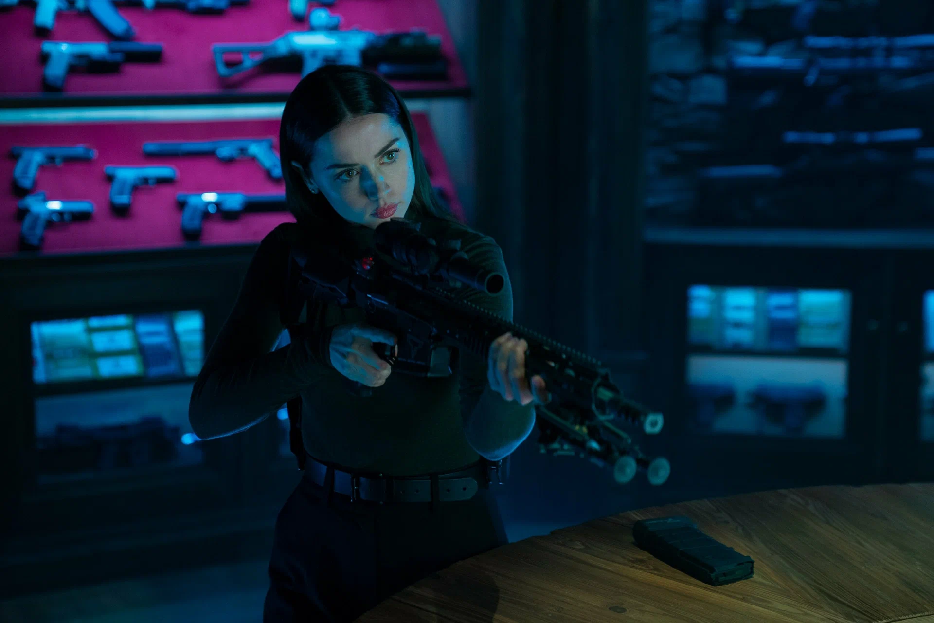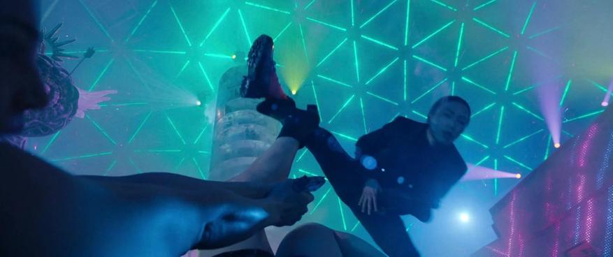 Звучит как плотный нео‑нуар‑боевик, но на экране всё рассыпается. Режиссёр Лен Уайзман и каскадёрская команда 87Eleven (под присмотром Чада Стахелски) выдают экшен, который часто сделан халтурно именно в логике действий. Самый показательный эпизод — ранняя тренировочная сцена и её «следы» в дальнейшем. Наставница говорит юной Еве «драться по своим правилам, как девчонка», после чего идёт монтажная нарезка: героиня то бьёт противников в пах кулаком, то в перестрелках прицельно стреляет им в пах вместо того, чтобы надёжно выключать из боя выстрелами по корпусу. Эта линия словно пришита чужой рукой — и это ощущение я связываю с подключением к правке сценария Эмеральд Феннелл. Её «подчерк» здесь рвёт тон франшизы и выглядит как авторская вставка ради «комментария», а не ради логики боя или персонажа.
