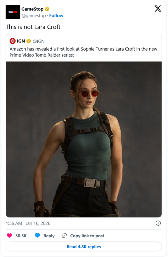 Американский ритейлер, занимающийся продажей физических копий видеоигр и игровых аксессуаров — GameStop — отреагировал на опубликованное изображение актрисы Софи Тёрнер в обличие Лары Крофт из сериала Tomb Raider от Amazon. Аккаунт магазина в социальной сети X ответил на пост написав: «Это не Лара Крофт».