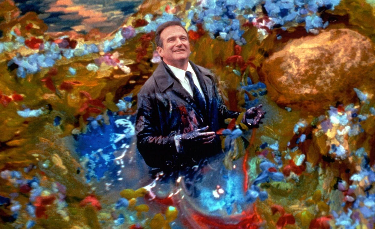Робин Уильямс играет врача, который после смерти попадает в живописный, как картина маслом, загробный мир. Но его душевный покой нарушает известие, что его жена покончила с собой и угодила в ад. Тогда он решает спуститься туда, чтобы найти её. Визуально фильм напоминает ожившие картины импрессионистов — смелый, дерзкий и трогательный опыт.