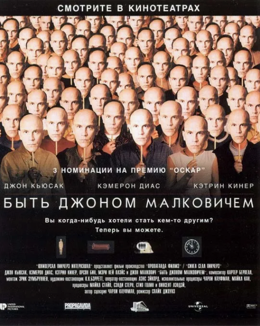 Чарли Кауфман создал самый эксцентричный сценарий: кукольник Джон Кьюсак находит портал в мозг актера Малковича. Пятнадцать минут в чужом сознании — это метафора тоски по другой жизни. Фильм иронизирует над голливудскими стереотипами: персонажи держат в неволе обезьян, а ад находится на 71/2 этаже небоскрёба. Спайк Джонз снял трагикомическую историю об идентичности, где даже Малкович пародирует самого себя.