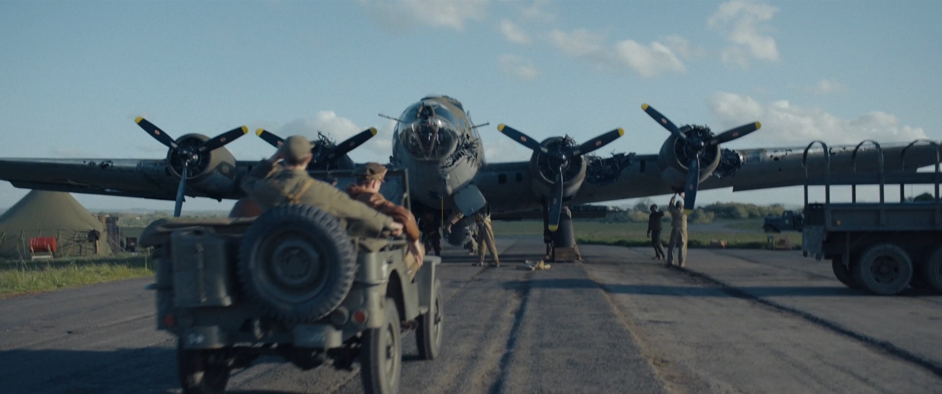 А вот это почему этот фильм смотреть не очень то хочется. Понятно, что нельзя всё экранное время уделять только воздушным боям. Всё-таки кино прежде всего про людей, а не про лётные испытания B-17. Но что же нам показали то про всех этих, без преувеличения, отважных молодых людей? Авторы не очень-то заморачивались с экспозицией. Никаких тебе лётных школ и довоенных событий. В первых сериях у нас тут сразу три главных героя, которым уделено хоть сколько-нибудь значимое внимание. Два друга майора: один невозмутимый крутой пилот, второй раздолбай и дебошир, но тоже крутой пилот. Ну, а третий штурман, от которого и ведётся повествование. Человек явно очень ответственный, сильно переживающий за других, со своими недостатками, но в тоже время также очень крутой штурман. Других персонажей даже запомнить то не за что. Да, один пилот решил попытаться спасти своего тяжело раненного товарища, но безуспешно. Два стрелка вернулись в Англию, благодаря подполью, но на этом их сюжетная линия и закончилась. Остальные просто погибают на заданиях и служат лишь массовкой. Да, скорее всего всё так и было. Может авторы и пытались показать, что многие люди погибли на их первом же боевом вылете, что многих даже не успевали запомнить в лицо и по имени. Да, опять же, скорее всего всё так и было. Вот только для драматического произведения, всё это явно не идёт на пользу. Именно поэтому сопереживать большинству персонажей просто не получается. Тут также часто озвучивают цифры потерь, что действительно ужасает, но только потому что так было в реальности. То есть если вырвать сценарий и персонажей из контекста второй мировой войны, то нам показали крайне слабую историю про каких-то там лётчиков. Причем здесь у многих не самых важных персонажей для сюжета, экранного времени больше, чем у экипажей B-17. При этом в фильме также уделено внимание и механикам, работа которых также весьма интересна сама по себе. И уж лучше бы им удели побольше времени.