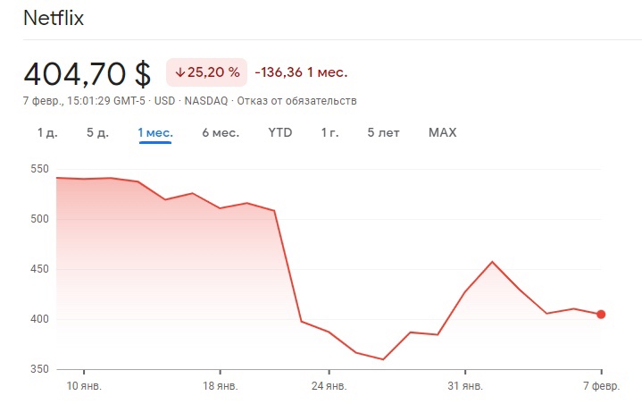 В последнее время стоимость акций компании «Netflix» довольно сильно просела. Еще в начале-середине января цена за одну акцию достигала 540 долларов и больше, тогда как сейчас акция едва ли стоит 400. На нижнем же пике стоимость падала вплоть до 350-360 долларов. Все это привело к существенному снижению капитализации компании. За это время сервис потерял несколько десятков миллиардов собственной стоимости. Но почему же так произошло?
