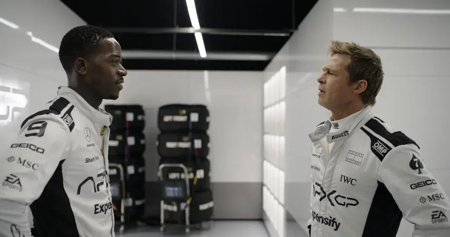 Брэд Питт хорошо сыграл гонщика с тяжелым прошлым и попыткой искупления. Роль напарника Сонни Хейса по имени Джошуа Пирс исполнил актер Демсон Идрис. Джошуа Пирс — это молодой, дерзкий и амбициозный гонщик. Между ним и Хейсом прослеживается хорошая химия. Хотя, на мой взгляд, персонажам не хватает глубины и проработанности. Несмотря на убедительную игру Питта и Идриса, сценарий оставляет ощущение недосказанности. Конфликт поколений между ветераном и молодым гонщиком обозначен, но не раскрыт в полной мере. Иногда возникает ощущение, что фильм боится замедлиться, чтобы дать героям поговорить, а не только соревноваться. В целом все актеры неплохо справились со своими ролями.