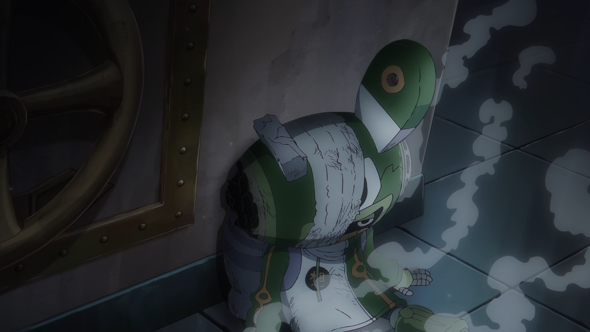 Здесь мне понравился Каку. Не только конкретно в этой сцене, но во всём эпизоде в целом — он несколько раз своим видом (даже когда внимание на нём не акцентировалось) дал понять, что ему искренне жаль Стусси. Возможно даже, он её частично понимает. Согласитесь, видеть Каку таким — это очень неожиданно учитывая, каким он был всегда раньше: пусть и выглядел порой как весельчак, но на деле всегда был безжалостным, жадным до сражений убийцей, как и все в CP9. Тут же нам намекают на то, что всё отнюдь не так просто как кажется, углубляя героя —без слов, без предысторий и так далее: просто ужимки и жесты и немного эмоциональной реакции на лице. В манге кстати это не так хорошо прослеживалось, ибо ему выделили не так много кадров.