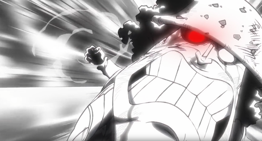 Во-первых, сам удар мне напомнил момент, когда Луффи врезал Тенрьюбито: тоже чёрно-белый экран, немного схожие эффекты и важность — удар освободил всех от напряжения, как и тогда. Только тогда напряжение было скорее психологическим, а здесь прям реальное. Кума таки пошёл по стопам Ники.