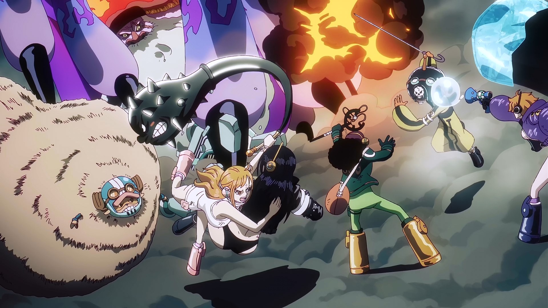 Дальше следует самая милая сцена серии, особенно если вы — как я — фанат Нико Робин: многие Мугивары — Нами, Чоппер, Брук, Усопп — защищают её от нападок Сатурна несмотря на то, что они в целом не особо любят сражаться, предпочитая убегать. Этот тот самый редкий случай, когда они не собираются поддаваться страху. Выглядят прям классно.
