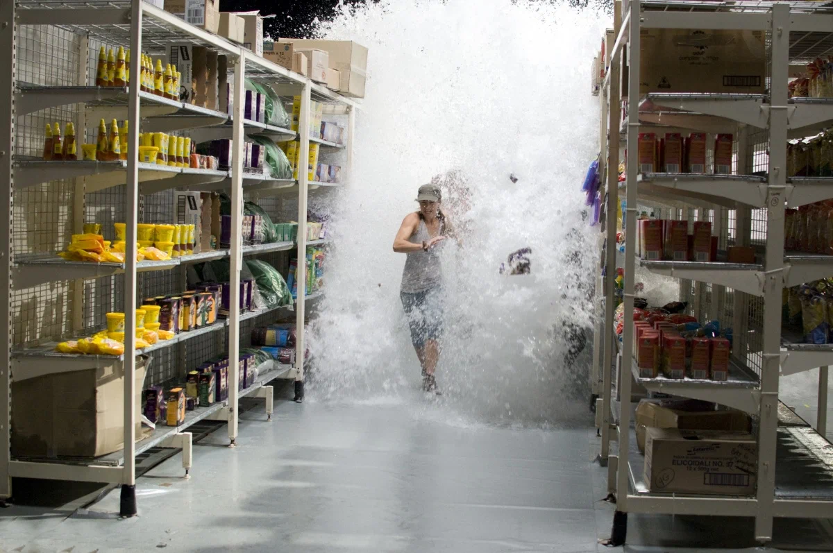 В фильме Кимбла Рендалла «Цунами 3D», помимо цунами, есть еще и белые акулы. После того как на побережье австралийского штата Квинсленд обрушилось мощное цунами, группа людей оказывается запертой в супермаркете, не имея возможности связаться с внешним миром. Кроме того, им приходится беспокоиться о большой белой акуле, которая проникла в супермаркет вместе с наводнением и ищет, чем бы перекусить.