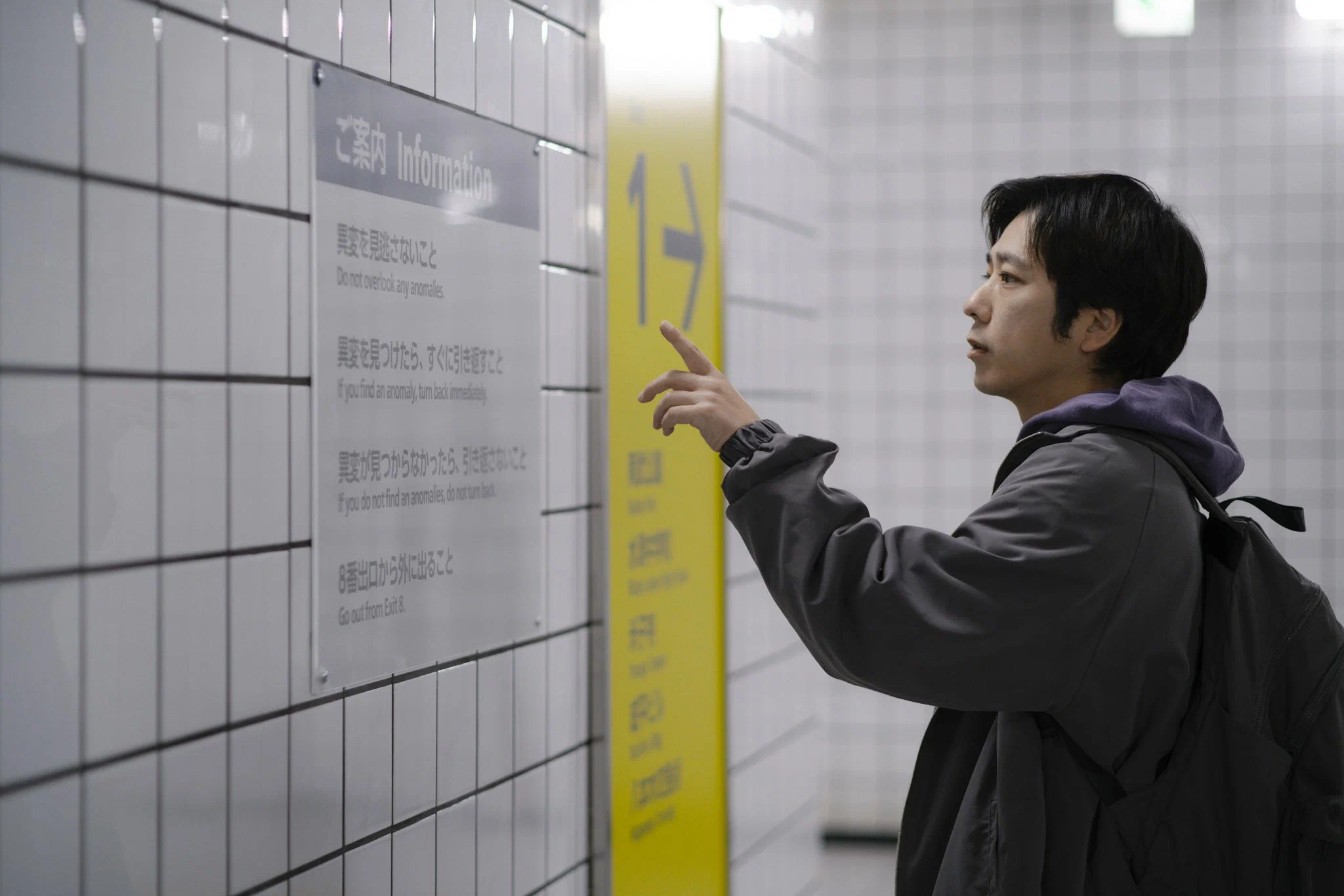 В некоторых сценах, видимо, чтобы хоть немного оправдать жанр, со стен стекает кровь, и несколько почти классических способов нагнать страха появляется. Достаточно жутко выглядит и лысеющий офисный работник, возникающий перед героем. С большой долей вероятности он олицетворяет страх героя превратиться в скучного взрослого, который сутками думает только об отчетах. Но настоящего ужаса в «Выходе 8» нет. Если фильм и пугает, то только экзистенциально — старением, однообразием и метрополитеном, в котором, как и в жизни, несложно заплутать.