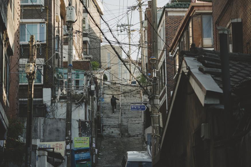 Основных мест съёмок всего два. Вначале мы видим полуподвальную квартиру, в которой ютится семья Ким. Это тесное, грязное и неуютное жилище вызывает самые печальные эмоции. Да ещё и окна выходят на неприглядную улицу, где видны ноги прохожих, валяющийся мусор и разный хлам.