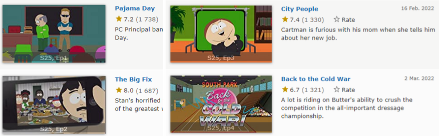 Расписывать почему та или иная серия лучше или хуже я не собираюсь, поскольку это не совсем в моей компетенции и весьма затратно по времени. Короче! Помимо полноценного сюжета, есть и другие отличия от привычного всем Южного Парка, причём не самые позитивные. Главная из которых, по крайней мере на мой взгляд - вторичность. В нынешние времена, есть куча тем, которые можно высмеивать, а сценаристы уделили им недостаточно времени. Даже напротив, в очередной раз они решили иронизировать на темы толерантности, огромного количества стриминговых сервисов и расизма.