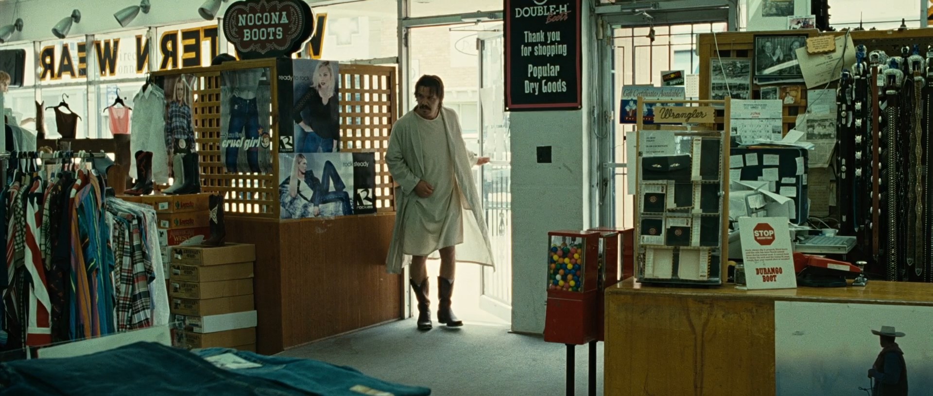 Постоянно попадают в рекомендациях шортсы на сцену с хозяином заправки, где Чигур кидает монету и решает судьбу этого человека. Я так понимаю, что это какая-то очень известная сцена. Меня лично куда больше впечатлило, где он со стаканом молока смотрел в выключенный телевизор. А через через некоторое время это же повторил и шериф, но только он ещё и выпил из стакана. Чигур ему молочка налил, видимо. А до этого этот телевизор смотрел Мосс с женой. Вот это, как по мне, куда более сильные сцены. Ну или, где он завалил своего нанимателя и пристально на него смотрел. Причем использование крупного плана Чигура куда страшнее, чем если бы он в кадре стоял с корчащемся нанимателем. Хавьер Бардем тут реально очень хорош. Вот актёрище, так актёрище.