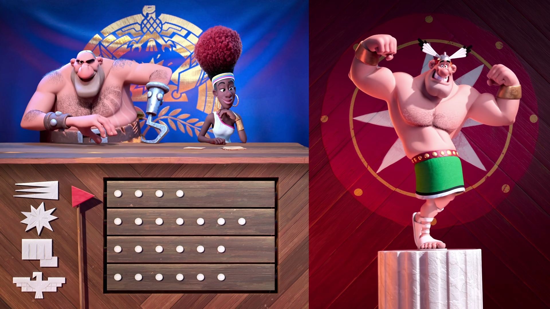 Астерикса озвучивал Руслан Барабанов. Работу Руслана можно было слышать в озвучке Кента в сериале «Уэнздей». Но основная работа Руслана — актёр в более привычном смысле. Из примечательного — роль в сериале, вошедшем в топ-250 на «Кинопоиске», «Шифр» 2018 года в роли директора ДОСААФ. Обеликса озвучил Александр Берг. Александр специализируется только на озвучке и нашему зрителю знаком по озвучке Пак Ён-шика в сериале «Игра в кальмара».