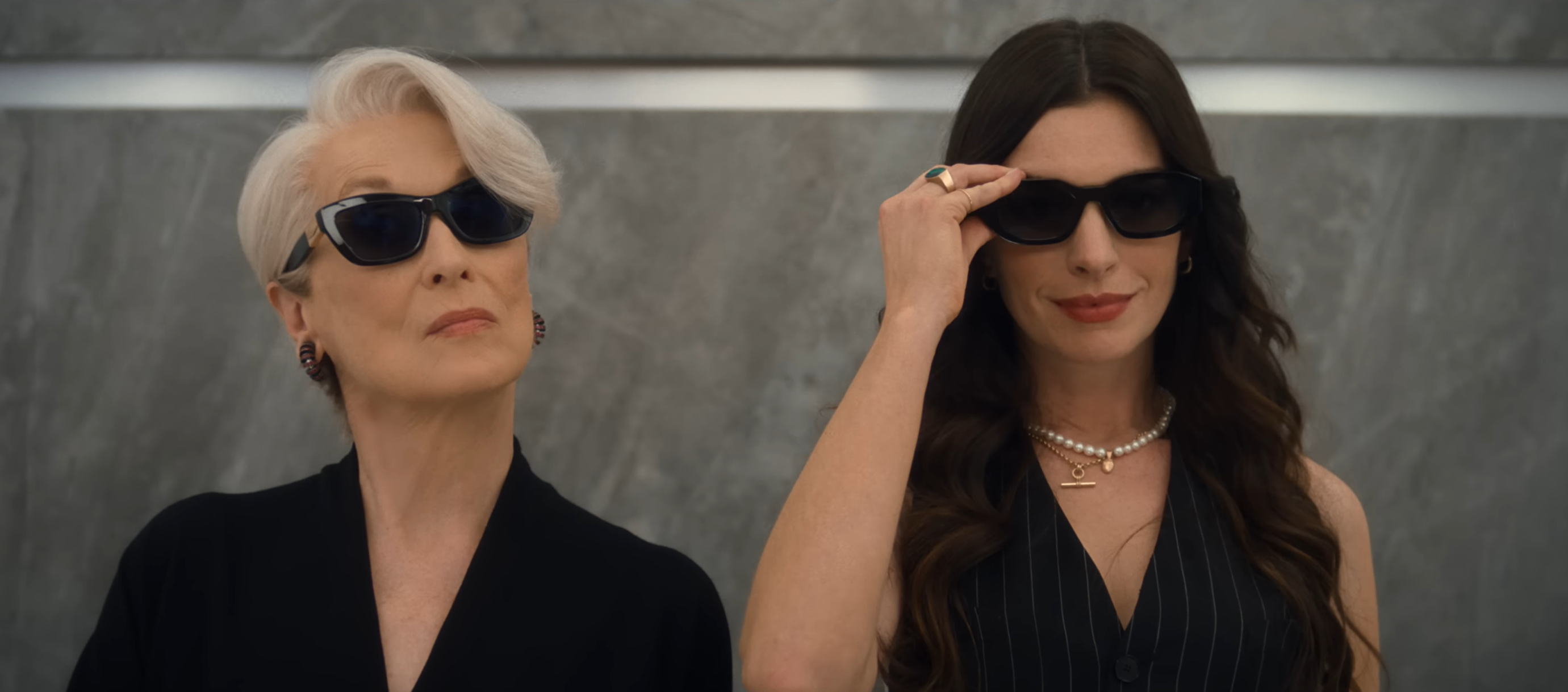 Камера поднимается выше и показывает привычный хаос закулисья: вспышки, пробку от шампанского, подготовку вечернего образа. Затем открываются двери лифта, в который входит Миранда Пристли. Через секунду в ту же кабину заходит Энди Сакс. Между ними звучит короткая реплика в их характерной манере, и двери закрываются под трек Vogue Мадонны. По официальному описанию действие сиквела разворачивается в наши дни. Миранда продолжает вести Runway уже в реальности, где медиарынок перестраивается, реклама уходит в цифровые форматы, печатные издания держатся с трудом, а конкуренция за внимание стала жестче. На фоне этих перемен возникает новый сюжетный пласт: бывшая ассистентка Эмили теперь занимает должность в Dior, и часть конфликта будет строиться на пересечении их карьерных траекторий. Энди также возвращается в историю, а участие Стэнли Туччи подтверждено.