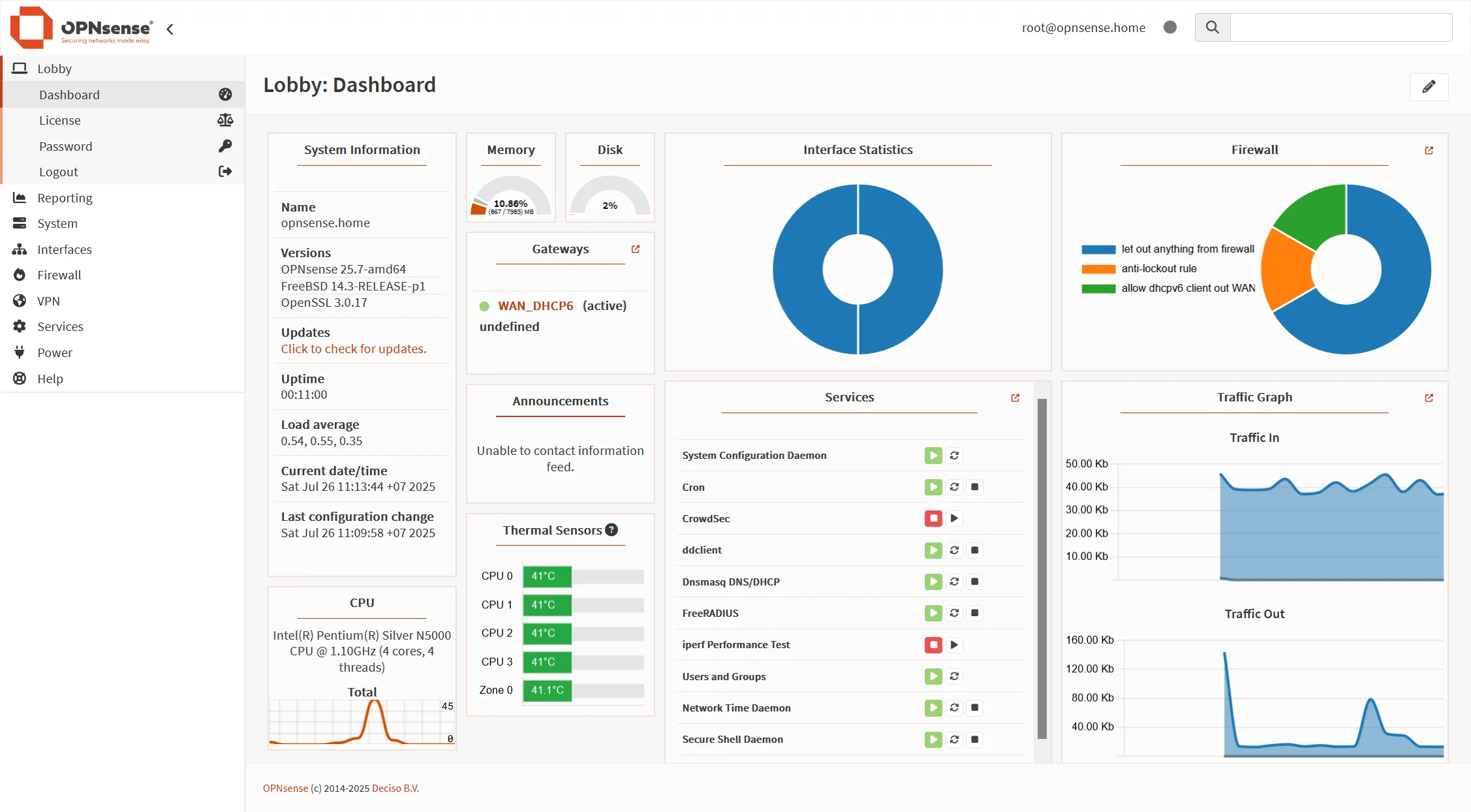 OPNsense — форк pfSense, отличается тем, что была создана как замена с целью сделать систему более современной, открытой и удобной для пользователей. В отличие от pfSense, она получила полностью переработанный веб-интерфейс с понятной навигацией, частые обновления безопасности и интегрированную систему плагинов для добавления новых функций без ручной настройки.