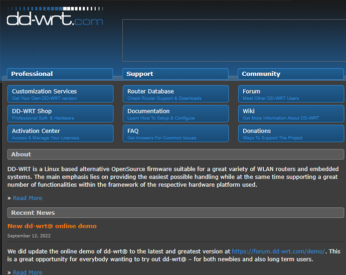 DD‑WRT — открытая прошивка на базе Linux, ориентированная на замену стандартной прошивки на старых домашних роутерах, с ограниченным объёмом flash памяти. Поддерживает множество моделей брендов вроде Linksys, Asus, Netgear и TP‑Link с популярными чипсетами Broadcom, Atheros, Ralink. Пользователь получает удобный веб-интерфейс, в котором встроены функции приватных сетей, QoS, VLAN, повторитель/усилитель сигнала и расширенная настройка Wi-Fi.