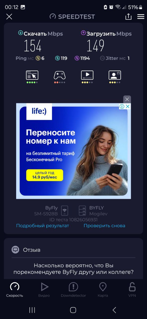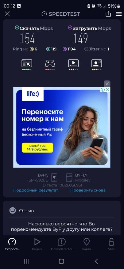 После установки SIM-карты в LT700 и подключения смартфона к Wi-Fi, раздаваемому роутером, ситуация изменилась: скачивание выросло до 154 Мбит/с, отдача составила 149 Мбит/с, а задержка сократилась до 6 мс, с минимальным джиттером в 1 мс. Такого прироста удалось добиться без дополнительной антенны или особых настроек — достаточно было установить устройство в удобной точке приема.