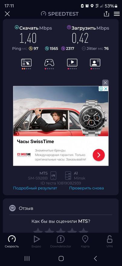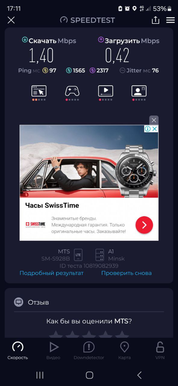 На первом этапе я проверил качество связи непосредственно на смартфоне Samsung Galaxy S24 Ultra. На улице уровень сигнала колебался в пределах -111 dBm, что на практике означает наличие соединения, но невозможность уверенно пользоваться интернетом. Скорость загрузки в таких условиях составила лишь 1.4 Мбит/с, а отдача — всего 0.42 Мбит/с. При этом пинг держался в районе 97 мс, а разброс значений джиттера указывал на нестабильность канала передачи. Такие параметры делают невозможной даже базовую работу с потоковым видео, не говоря о звонках в мессенджерах или загрузке крупных файлов.