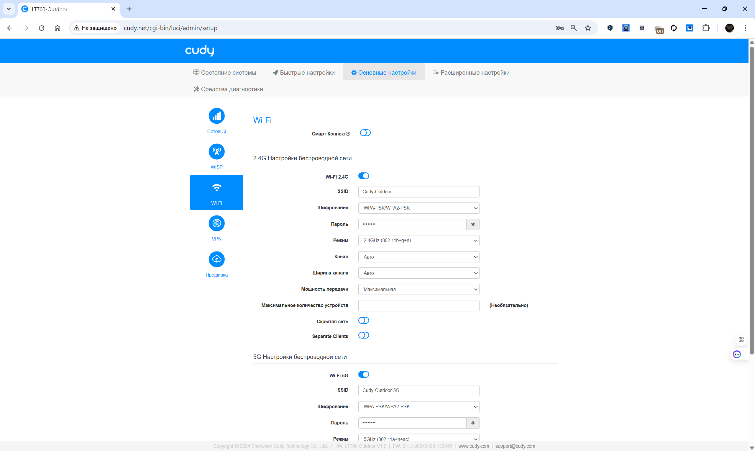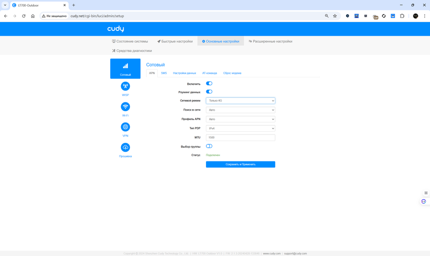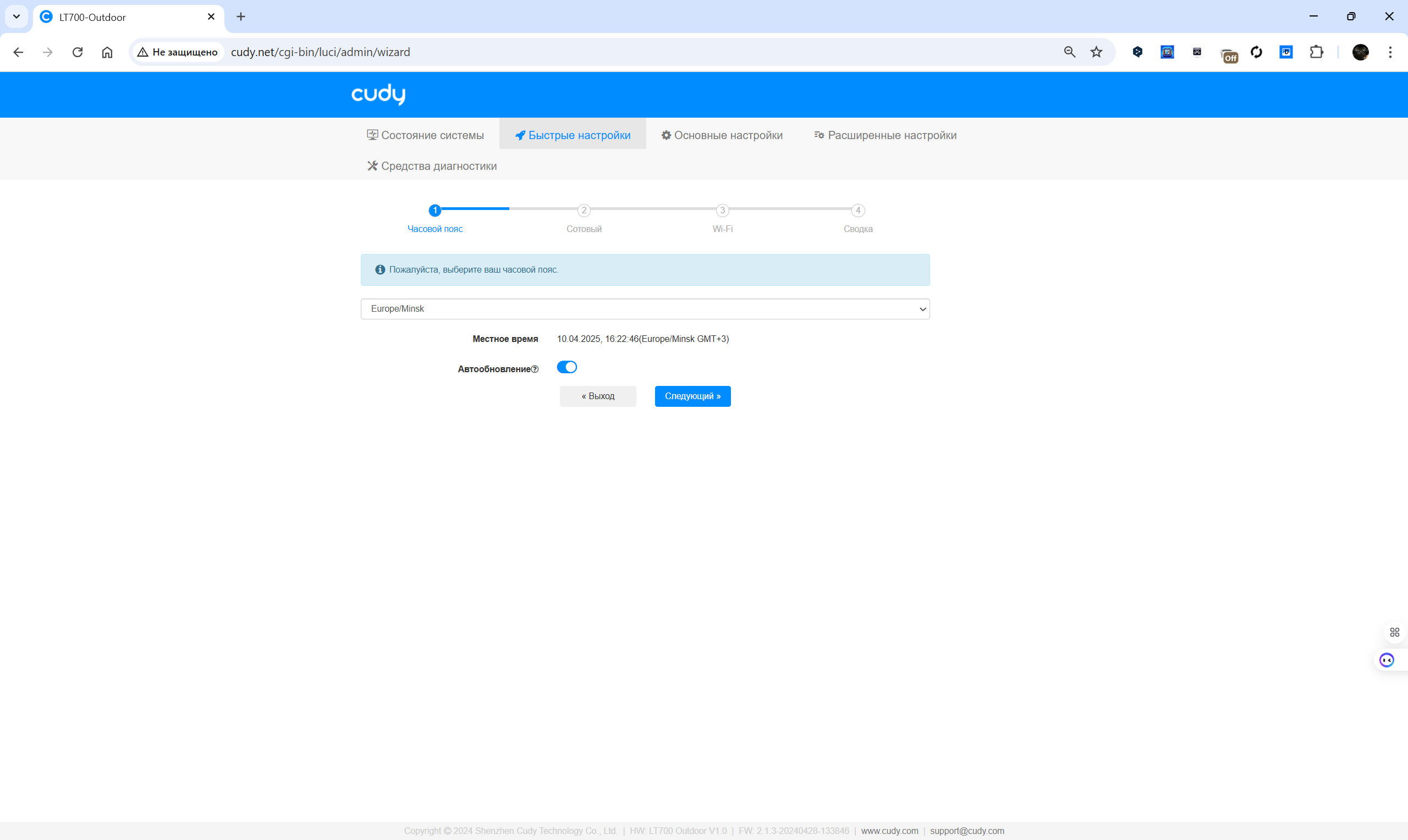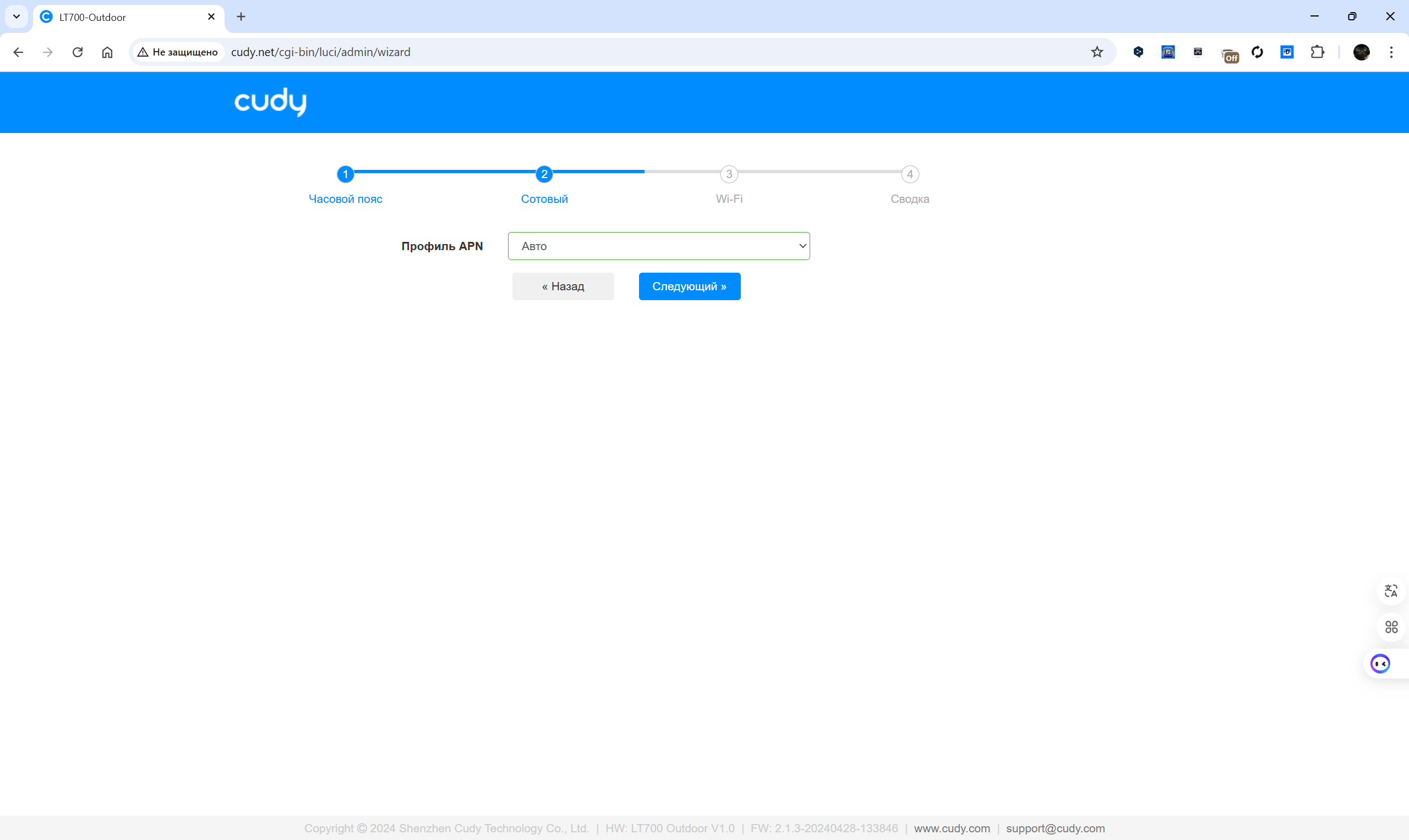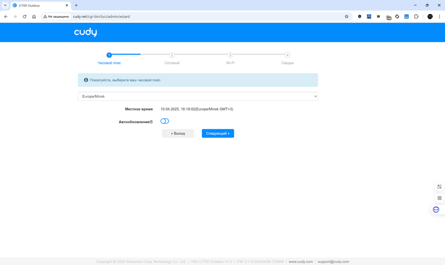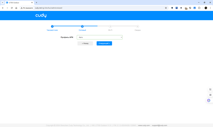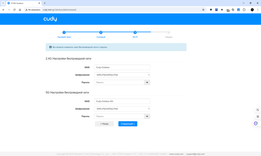Веб-интерфейс маршрутизатора Cudy LT700 Outdoor выполнен в виде пошагового мастера и основной панели с разделами, упрощающими работу с устройством. Начальная настройка предлагает выбрать часовой пояс, задать параметры подключения к мобильной сети, создать Wi-Fi-сеть и получить сводку по текущей конфигурации. Пользователь может вручную установить профиль APN или довериться автоматической настройке, изменить SSID, выбрать режим работы сети и установить пароль. Для двух диапазонов Wi-Fi (2.4 ГГц и 5 ГГц) доступны расширенные параметры, включая выбор режима, канала, ширины полосы и мощности передачи.