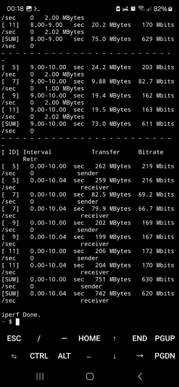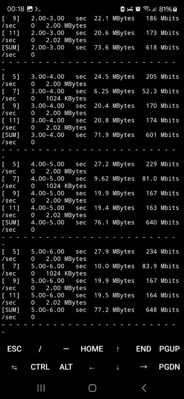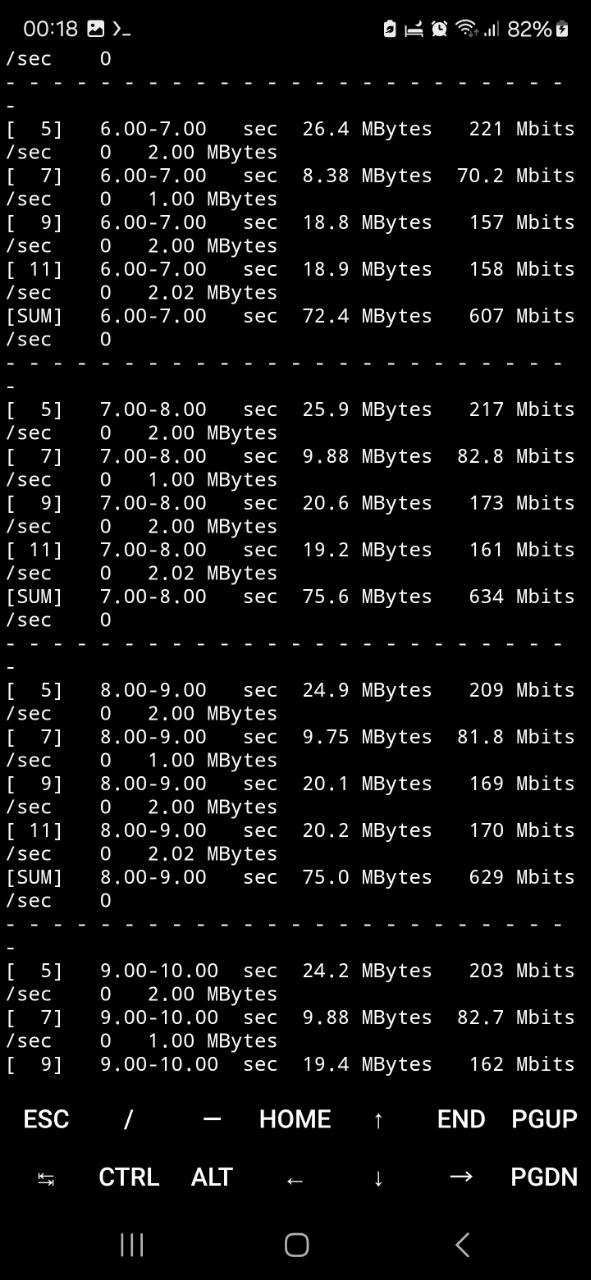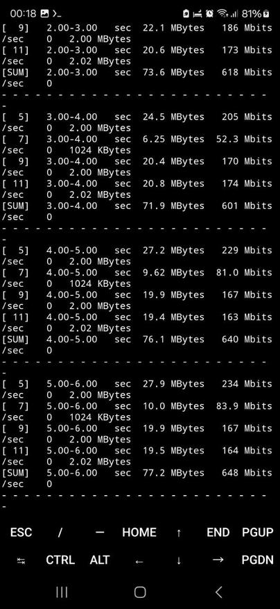Результаты, отображены на скриншотах ниже. Видно, что устройство демонстрирует стабильную и высокую пропускную способность, соответствующую заявленным характеристикам модуля 5 ГГц. В среднем значения совокупной скорости передачи по Wi-Fi составили около 620-650 Мбит/с, при этом наблюдалось минимальное количество повторных передач (Retr = 0), что говорит о хорошем качестве канала, низком уровне интерференции и корректной работе антенн и радиомодуля устройства.
