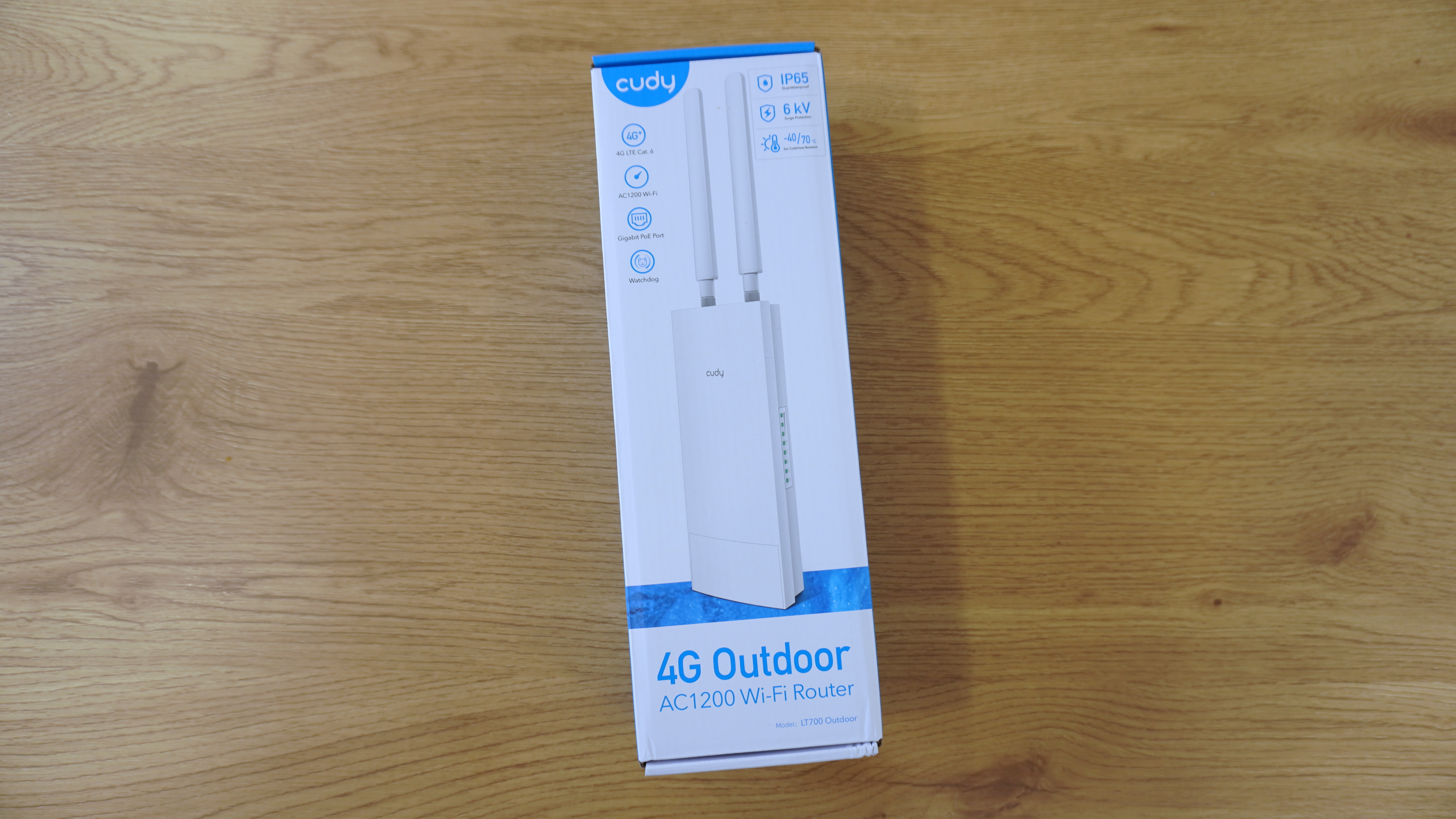 Коробка устройства выполнена в вертикальном формате и оформлена в бело-синих тонах. На лицевой стороне указано название модели — Cudy LT700 Outdoor — с изображением самого роутера и ключевыми характеристиками: поддержка 4G LTE Cat.6, AC1200 Wi-Fi, гигабитный PoE-порт, защита IP65 и работа при экстремальных температурах от -40 до +70 °C. Упаковка дает представление о назначении устройства и его возможностях при установке вне помещения.