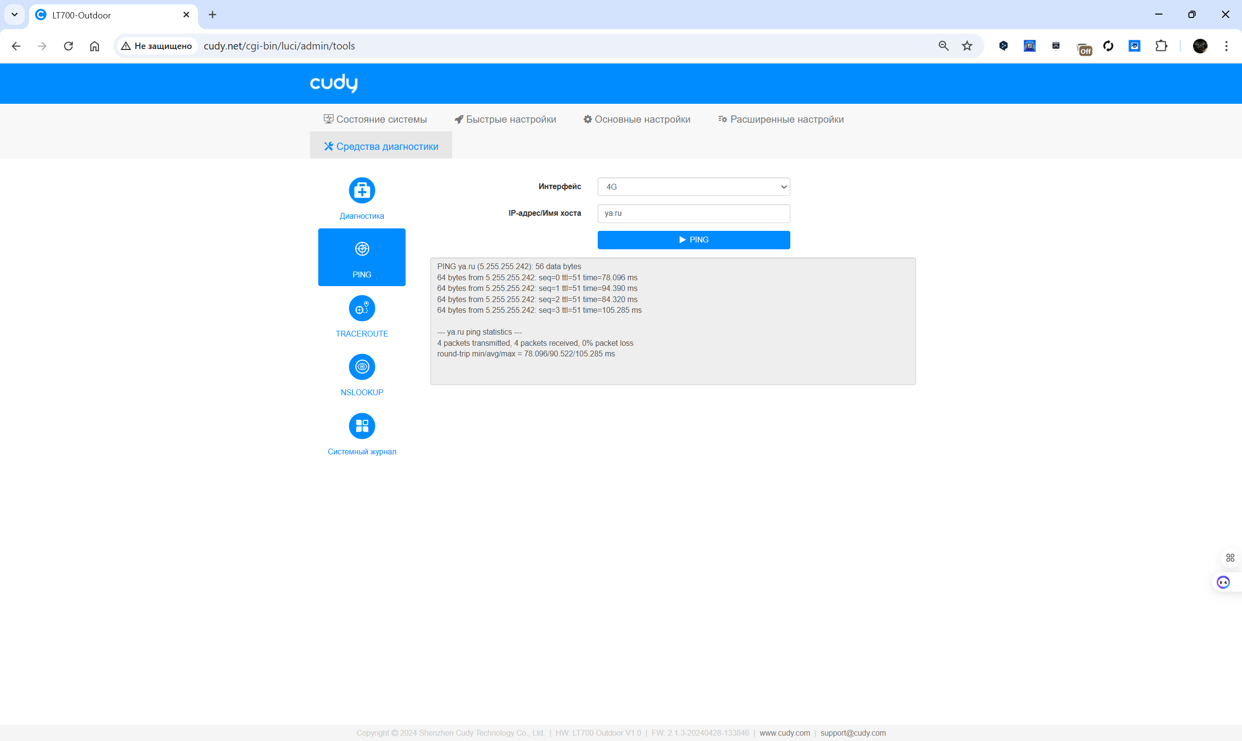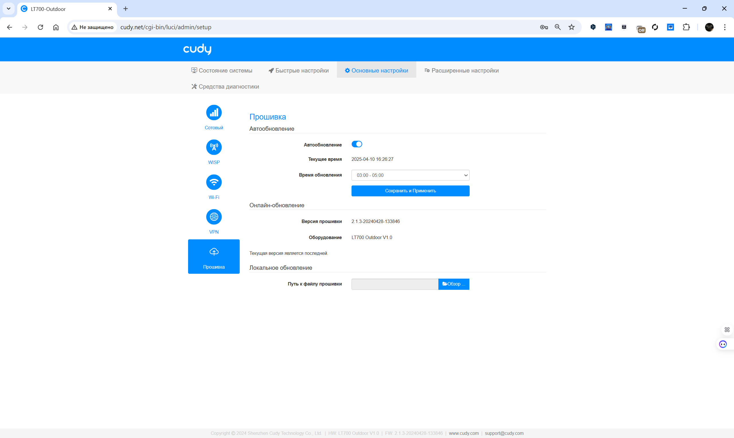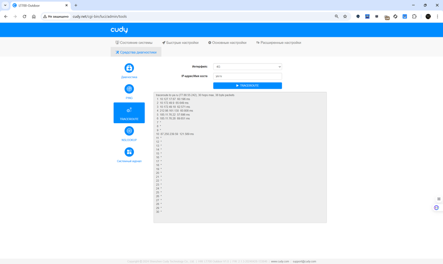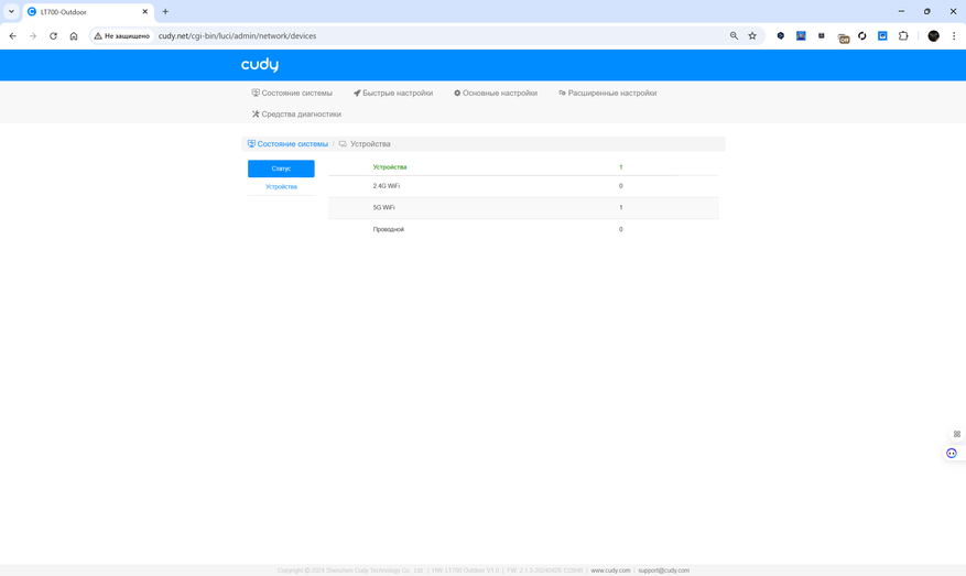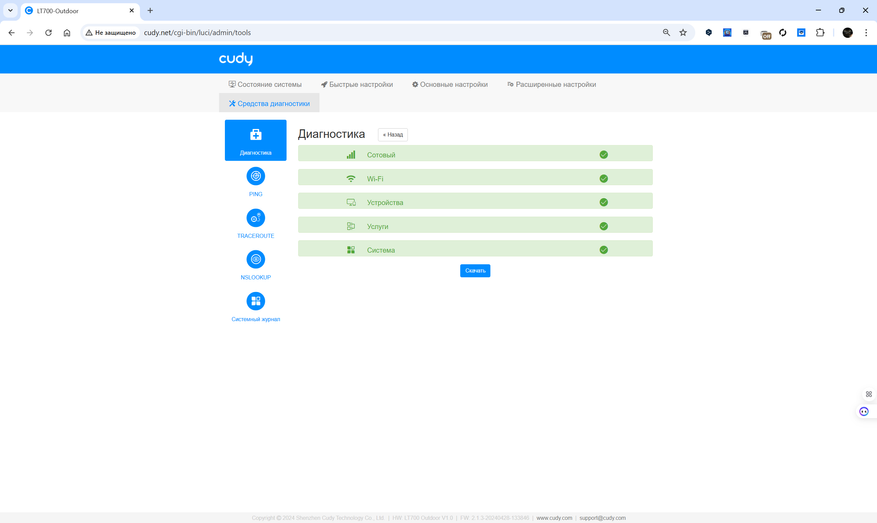 Обновление прошивки может выполняться автоматически в заданный интервал или вручную с загрузкой файла. Раздел диагностики позволяет проводить базовые сетевые тесты: ping, traceroute, nslookup, просматривать системный журнал и оценивать текущее состояние каналов. Для продвинутых пользователей предусмотрены инструменты VPN и режим WISP. Визуальное представление статуса соединения и подключенных клиентов отображается в реальном времени, что упрощает контроль за работой устройства.