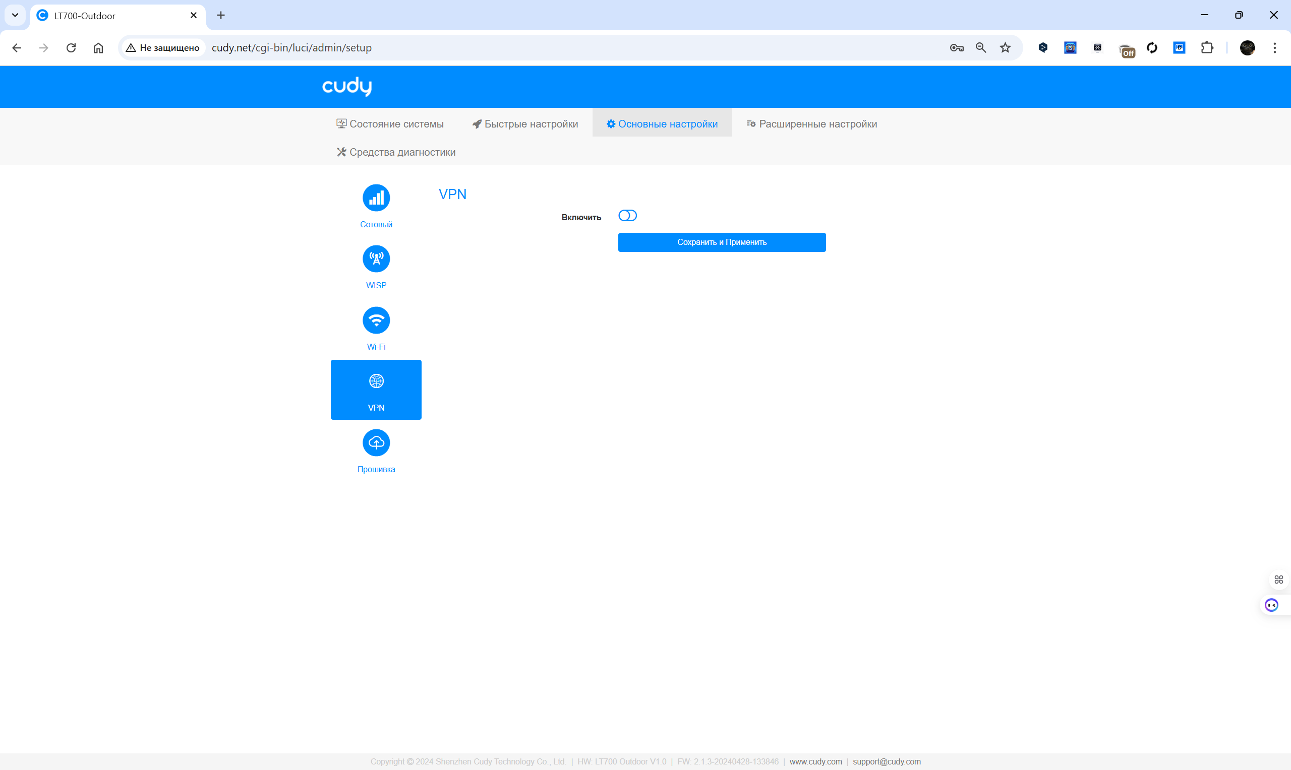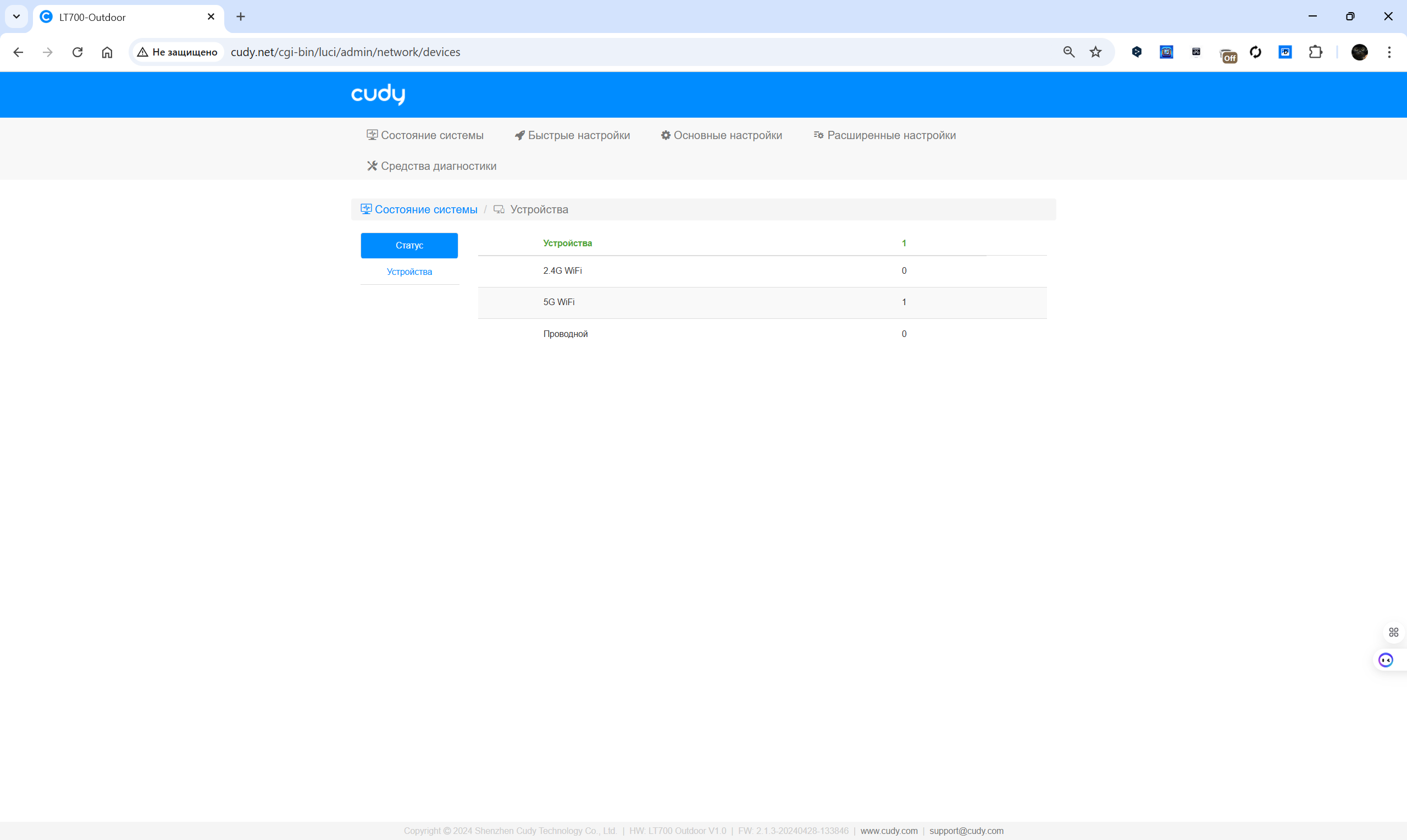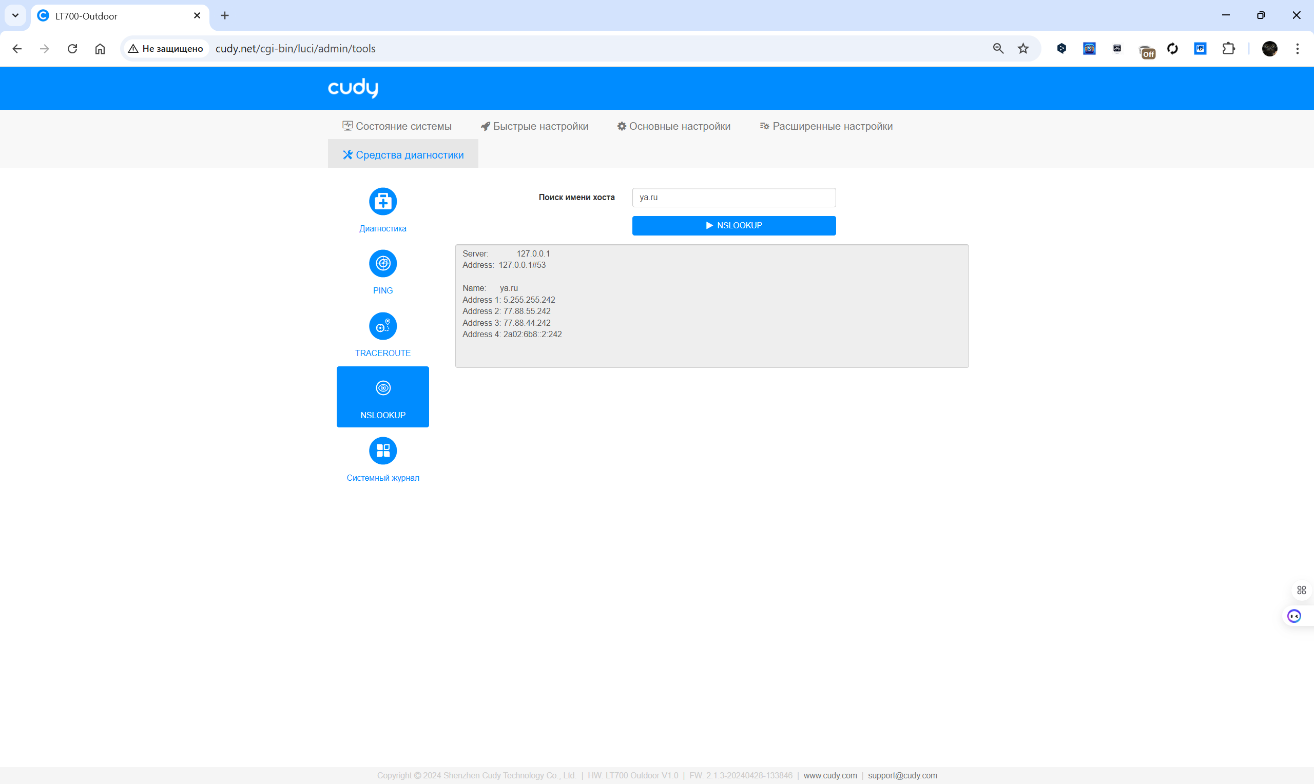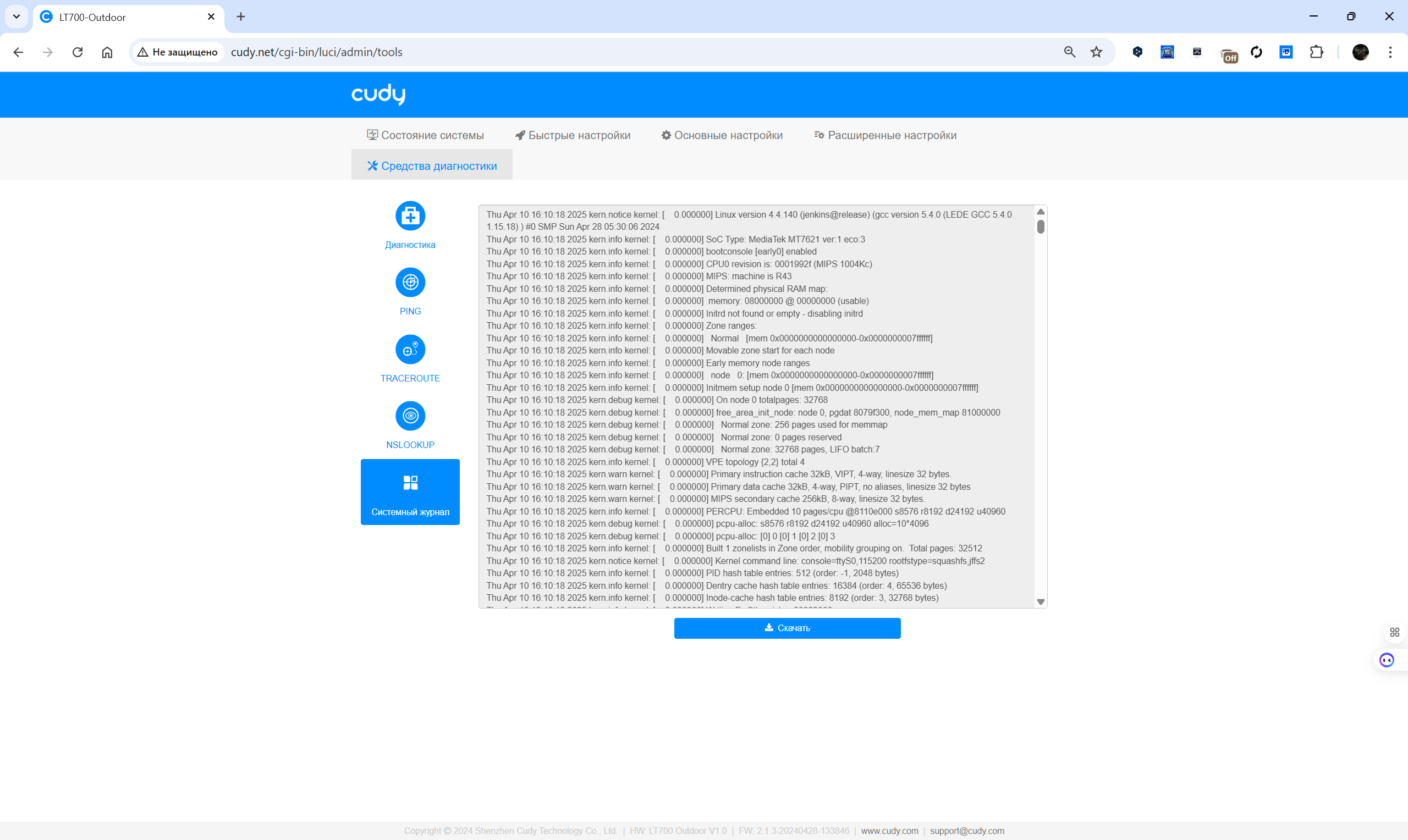 Обновление прошивки может выполняться автоматически в заданный интервал или вручную с загрузкой файла. Раздел диагностики позволяет проводить базовые сетевые тесты: ping, traceroute, nslookup, просматривать системный журнал и оценивать текущее состояние каналов. Для продвинутых пользователей предусмотрены инструменты VPN и режим WISP. Визуальное представление статуса соединения и подключенных клиентов отображается в реальном времени, что упрощает контроль за работой устройства.