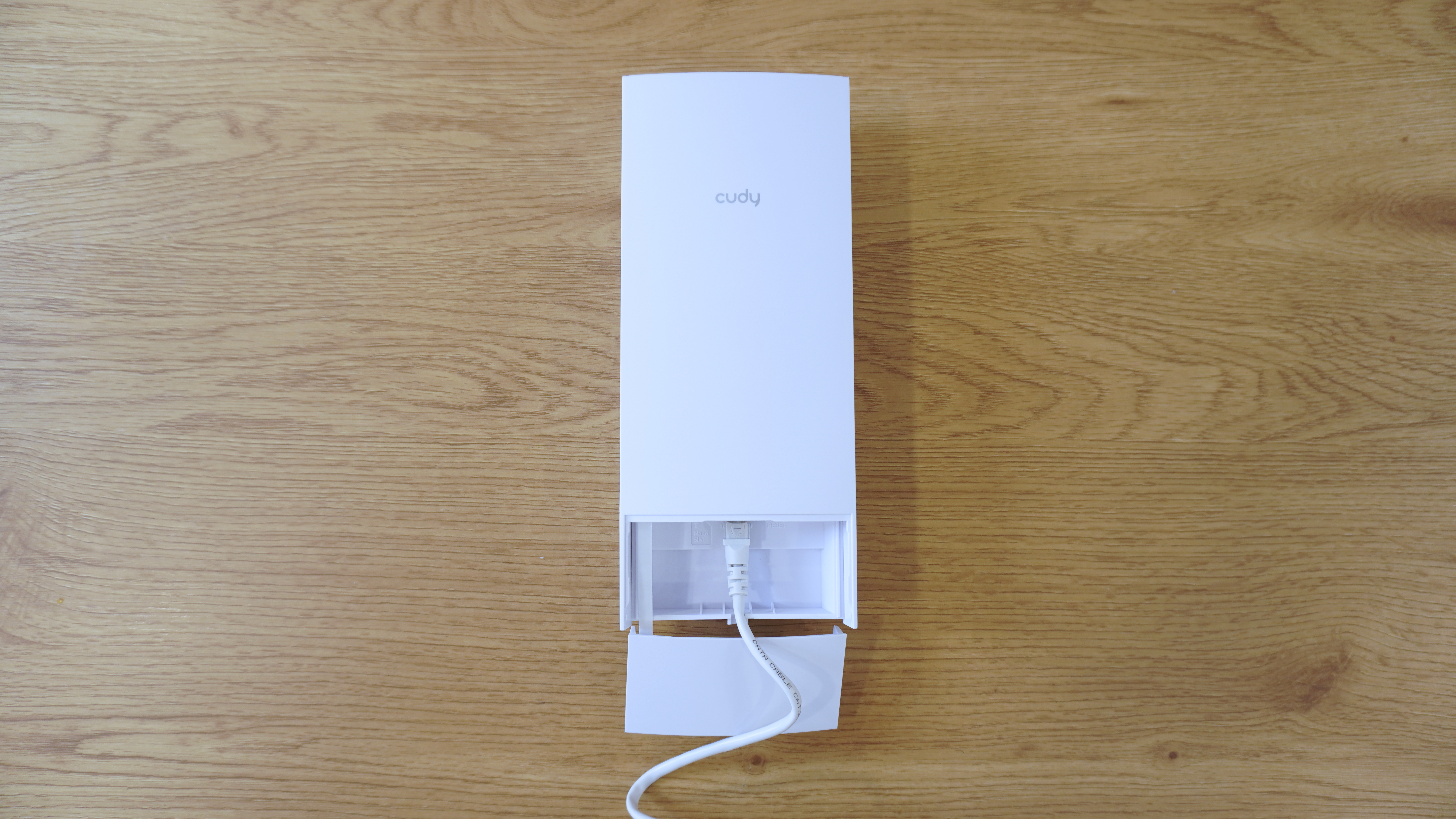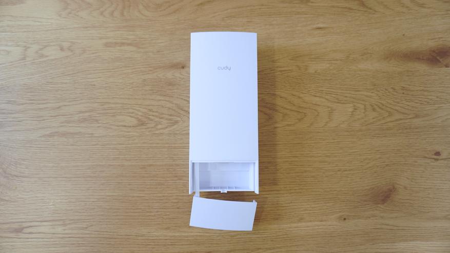 Внешний вид устройства LT700 Outdoor 1.0 подчеркивает его уличное назначение — корпус выполнен в вытянутом вертикальном форм-факторе с минималистичным дизайном и полностью матовой белой поверхностью. Пропорции корпуса сбалансированы, все углы скруглены, что способствует снижению образования наледи и накопления пыли при эксплуатации на улице. На передней панели расположен логотип бренда Cudy, других декоративных элементов не предусмотрено. В нижней части предусмотрена защелкивающаяся крышка, скрывающая технические разъемы и слот для сим-карты — это решение защищает от попадания влаги и пыли, при этом позволяет быстро получить доступ к внутренним интерфейсам.
