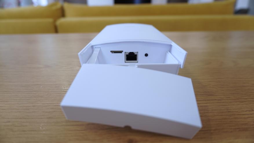Нижний торец устройства, как уже отмечалось, закрыт откидной панелью. Под ней размещен слот под карту nano-SIM, порт Ethernet с поддержкой питания PoE и кнопка Reset. Все элементы утоплены внутрь корпуса, что дополнительно снижает вероятность случайного повреждения при установке. При закрытой крышке обеспечивается герметичность, соответствующая стандарту IP65.