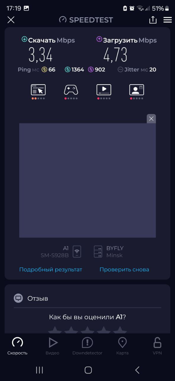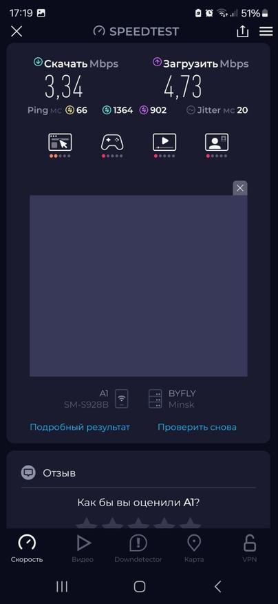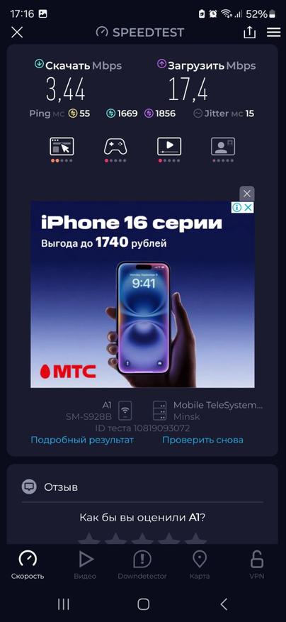 Измерения скорости проводились по беспроводному соединению, установленному между смартфоном и маршрутизатором. Результаты показали загрузку в 3.44 Мбит/с и отдачу в 17.4 Мбит/с. При этом латентность составила 55 мс, а джиттер — 15 мс. Эти параметры свидетельствуют о том, что LT700 эффективно справляется со своей задачей обеспечения канала связи. Особенно стоит отметить высокий показатель аплоада, что косвенно подтверждает качественную работу антенны при передаче данных в сеть.