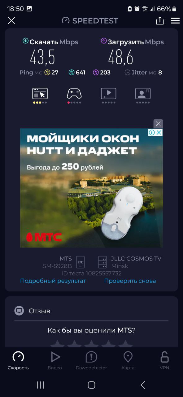 Результаты говорят сами за себя. При прямом подключении смартфона к LTE сеть обеспечивала стабильную, но не особенно высокую скорость: 43.5 Мбит/с на скачивание и 48.6 Мбит/с на отдачу, с пингом в районе 27 мс и джиттером 8 мс. Эти параметры находятся на уровне, достаточном для большинства задач, однако запас по производительности явно ограничен, особенно при подключении нескольких устройств одновременно.