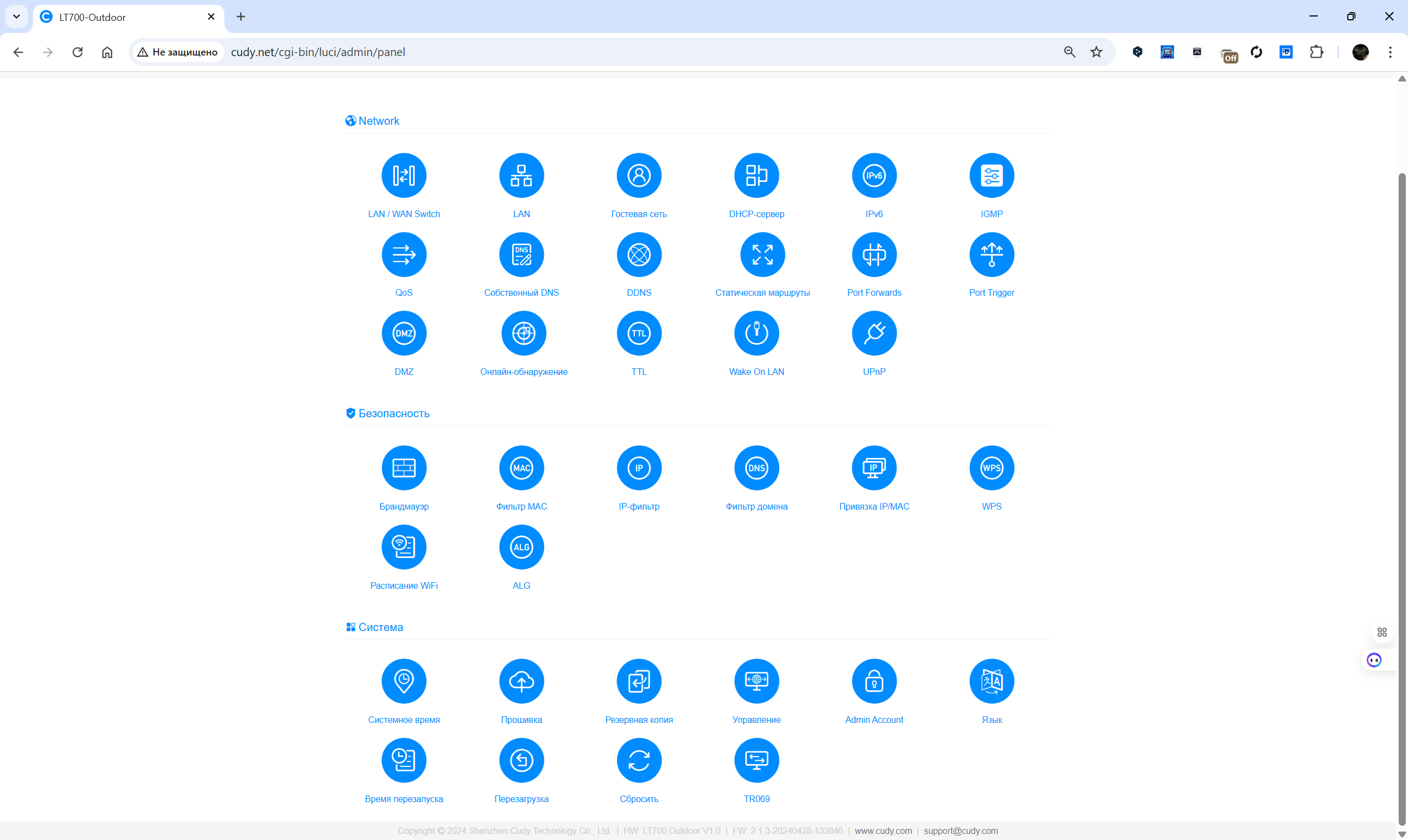 Панель управления делится на несколько зон: основные параметры сети, настройки безопасности и системные функции. Реализованы возможности переключения LAN/WAN, назначения статических маршрутов, управления гостевой сетью, активации DDNS, настройки DMZ и UPnP, а также включения QoS. В разделе безопасности находятся инструменты фильтрации по MAC и IP-адресам, расписание доступа по Wi-Fi и параметры WPS. Системный блок содержит элементы для настройки времени, резервного копирования, сброса, смены языка и управления обновлениями.