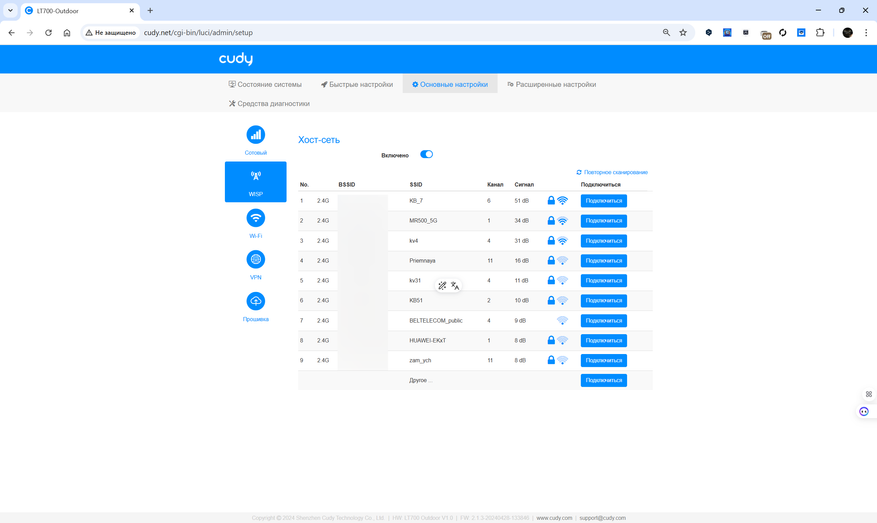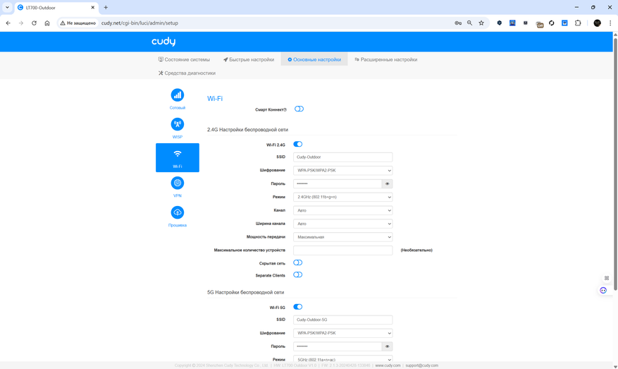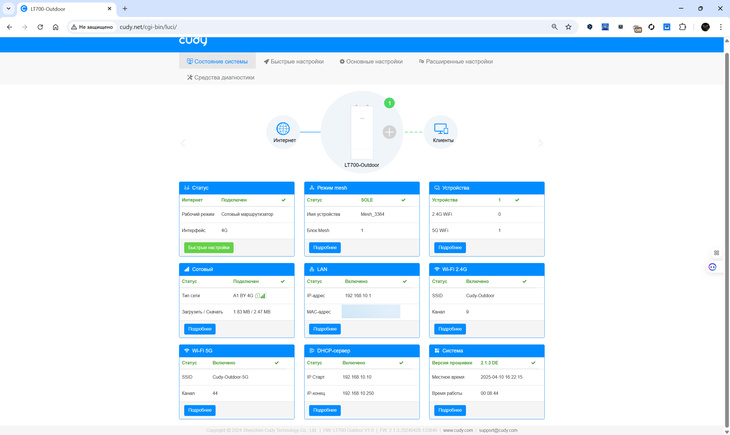 Также предусмотрена возможность интеграции с Mesh-сетями от Cudy, где LT700 Outdoor может выполнять роль главного узла. В этом режиме возможно как проводное, так и беспроводное соединение с другими устройствами. Из дополнительных сетевых функций — VPN-серверы и клиенты, включая OpenVPN, WireGuard, IPsec и PPTP, а также настройка гостевых сетей, управление доступом по MAC-адресам и работа с DNS через TLS. Все управление осуществляется через веб-интерфейс или мобильное приложение, а обновление прошивки возможно как вручную, так и через интернет.