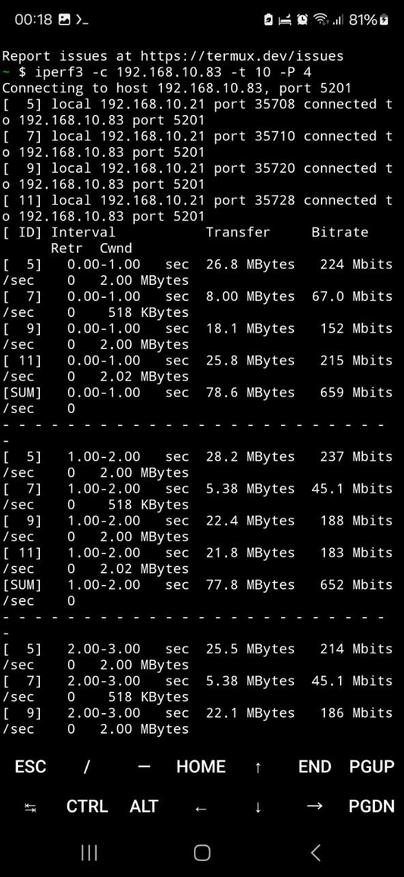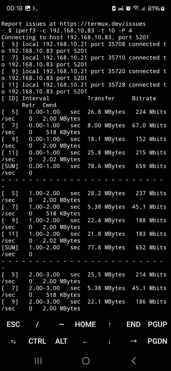 Использовалась команда с четырьмя параллельными потоками (-P 4) и длительностью теста в 10 секунд (-t 10). Этот подход позволил равномерно распределить нагрузку и выявить предельные значения пропускной способности беспроводного соединения.