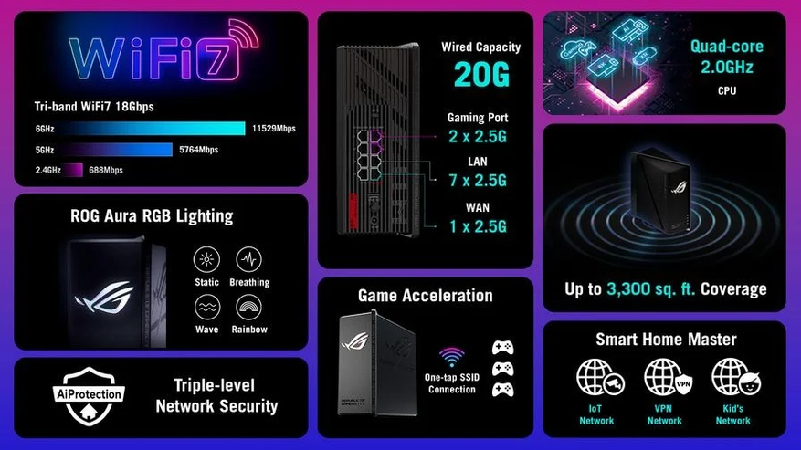 Роутер поддерживает трехдиапазонный WiFi 7 с общей пропускной способностью до 18 Гбит/с. В нем реализованы каналы шириной 320 МГц, модуляция 4K-QAM и технология Multi-Link Operation (MLO) для обеспечения стабильного соединения. Для проводных соединений предусмотрено два игровых порта 2.5G, которые в сумме обеспечивают до 20 Гбит/с.