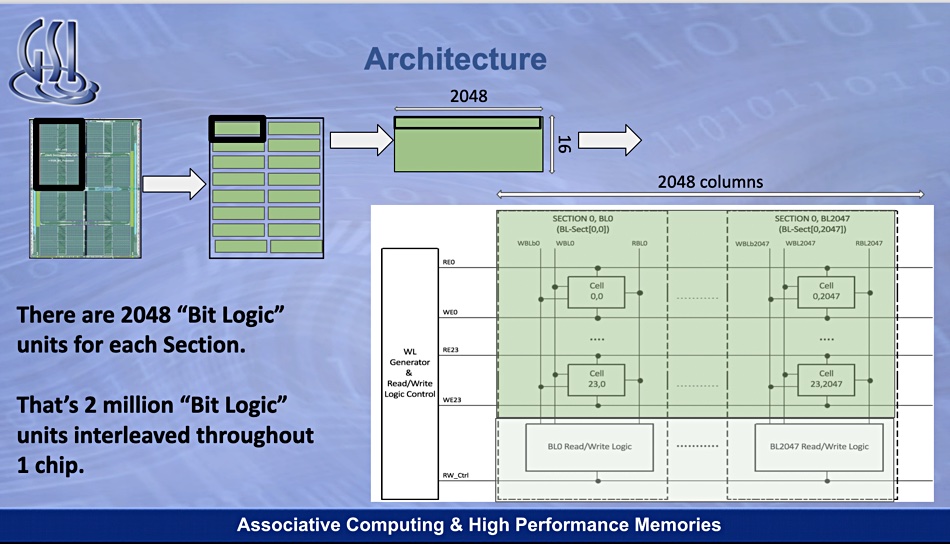 GSI интегрировала двоичные вычислительные блоки в линии чтение-изменение-запись SRAM памяти, что позволило всем псевдопроцессорам работать параллельно.