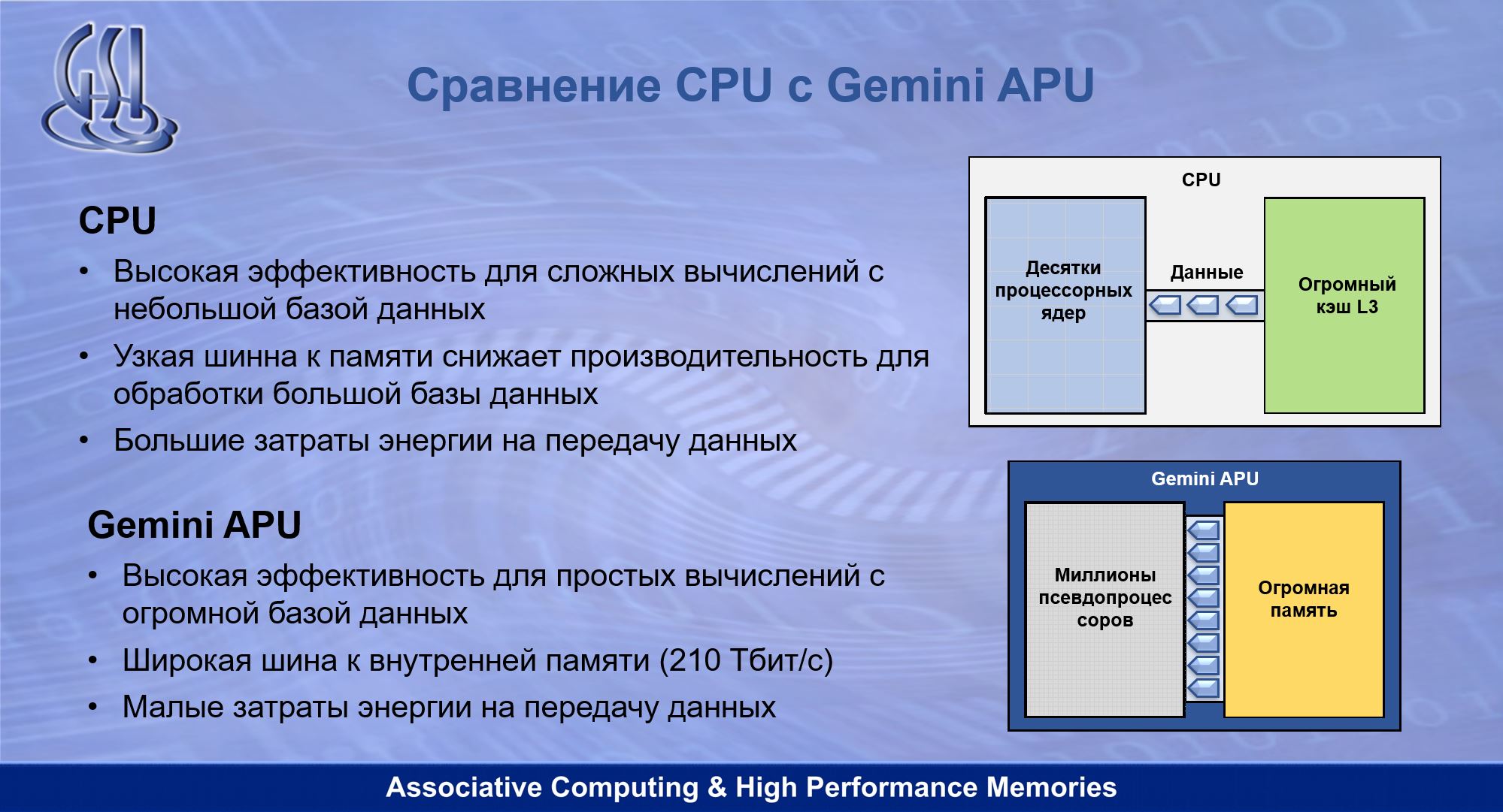 Процессор Gemini APU по своей сути является вычислительным модулем, предназначенным для разгрузки основного процессора сервера от выполнения большого количества однотипных операций, освобождая его для более сложных задач. Gemini APU выполняет поиск в БД значительно быстрее, чем х86 процессор.