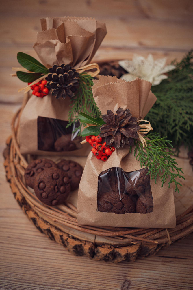 - Авторская упаковка творит чудеса. Крафтовая бумага, перевязанная бечёвкой, с веточкой живой ели и шишкой — классика, которая никогда не надоест. Льняной мешочек с вышивкой «2026» выглядит благородно и по-домашнему. А коробка, украшенная сухоцветами, корицей и золотыми блёстками, превращает подарок в произведение искусства.