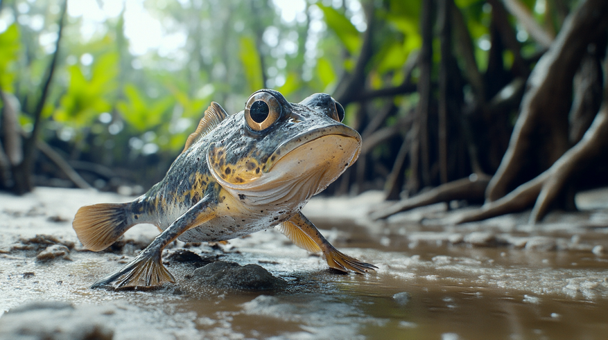 Учёные называют этот тип движения crutching — что-то вроде «ходьбы на костылях». Рыба опускается на дно, приподнимает тело, делает неуклюжий, но уверенный шаг. Особенно хорошо это видно у илистых прыгунчиков — удивительных представителей подсемейства Oxudercinae. Они не только ходят по дну, но и без проблем выбираются на сушу. Дышат кожей и ротовой полостью, сидят на корягах, прыгают по берегу — и порой проводят на воздухе больше времени, чем в воде. Анатомия у них тоже особенная: грудные плавники работают почти как локтевые суставы. Их мускулатура устроена так, чтобы выдерживать вес тела в условиях гравитации — не воды, а воздуха. Это уже не просто рыба, это граница между водой и сушей, живая подсказка того, как могла начаться эволюция земных животных.