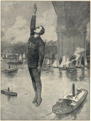 В 1885 году инструктор по плаванию по имени Роберт Одлум решил развеять эти страхи. Он правильно сказал, что вы можете провалиться сквозь большое количество воздуха, не получив никаких травм. Чтобы доказать это, возможно, он мог прыгнуть с большой высоты на одну из этих сетей или с привязанным к ноге тросом для тарзанки. Вместо этого он устроил публичный трюк, прыгнув с Бруклинского моста в воду. Удар по воздуху не убивает, но удар по воде точно может, поэтому Роберт Одлум умер в возрасте 33 лет.