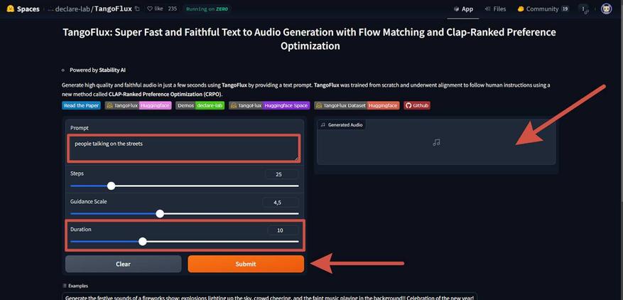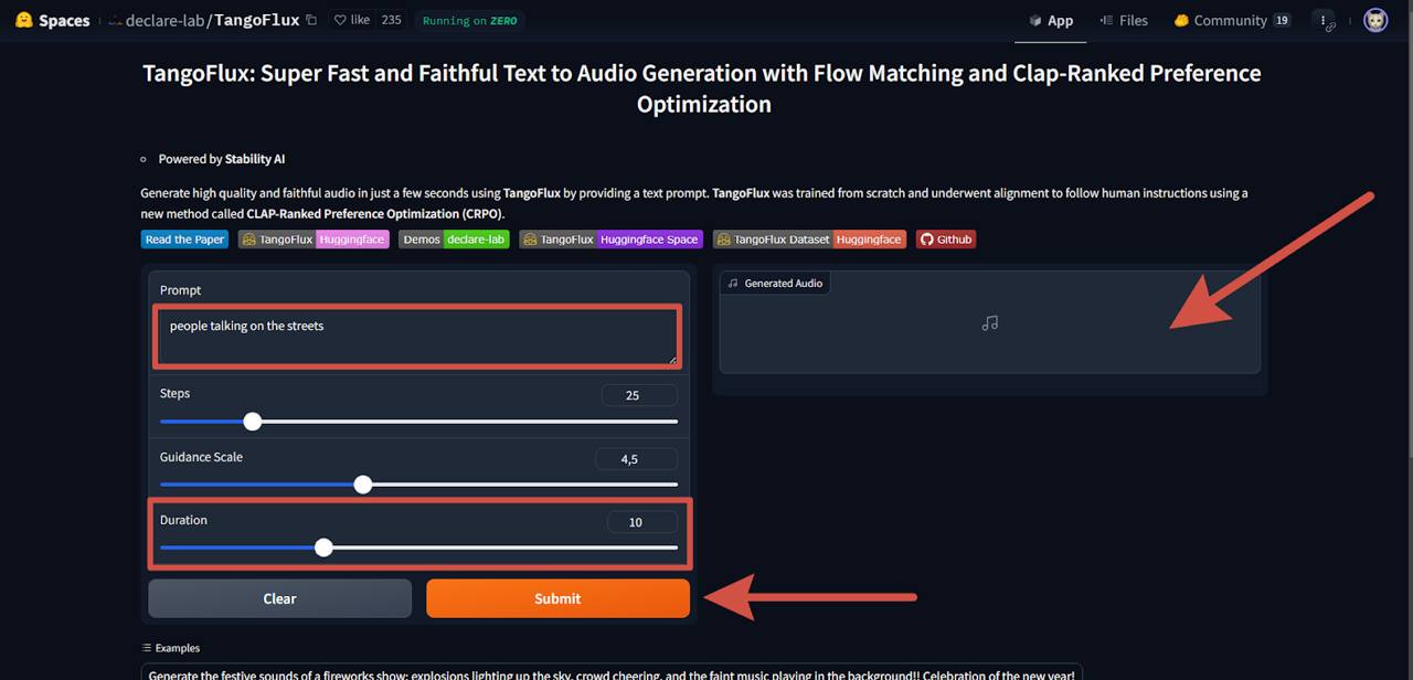 Модель TangoFlux от Declare-lab — это модель для генерации аудио из текста, которая может создавать аудиофайлы длительностью до 30 секунд. Она использует текстовые промты для генерации высококачественного аудио.