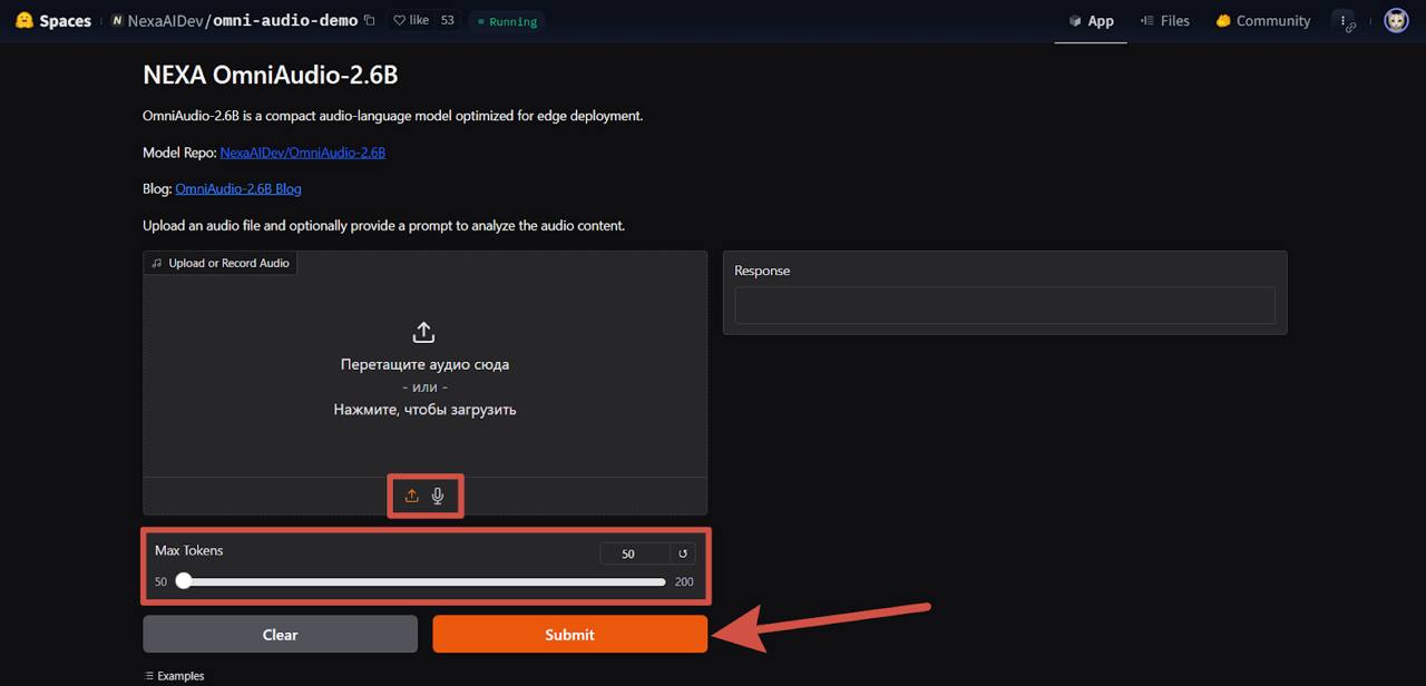 Переходим в пространство OmniAudio, выбираем способ загрузки аудиофайла: запись с микрофона или готовый файл. Затем можно выбрать максимальное количество слов для ответа (от 50 до 200). Для запуска нажимаем на кнопку «Submit».