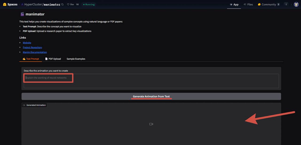 В пространстве Manimator вводим текстовый промт, а затем нажимаем на кнопку «Generate Animation from Text».