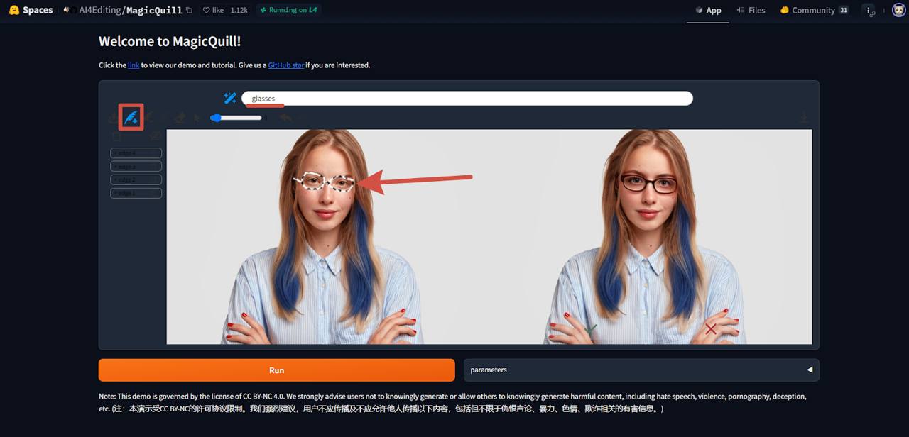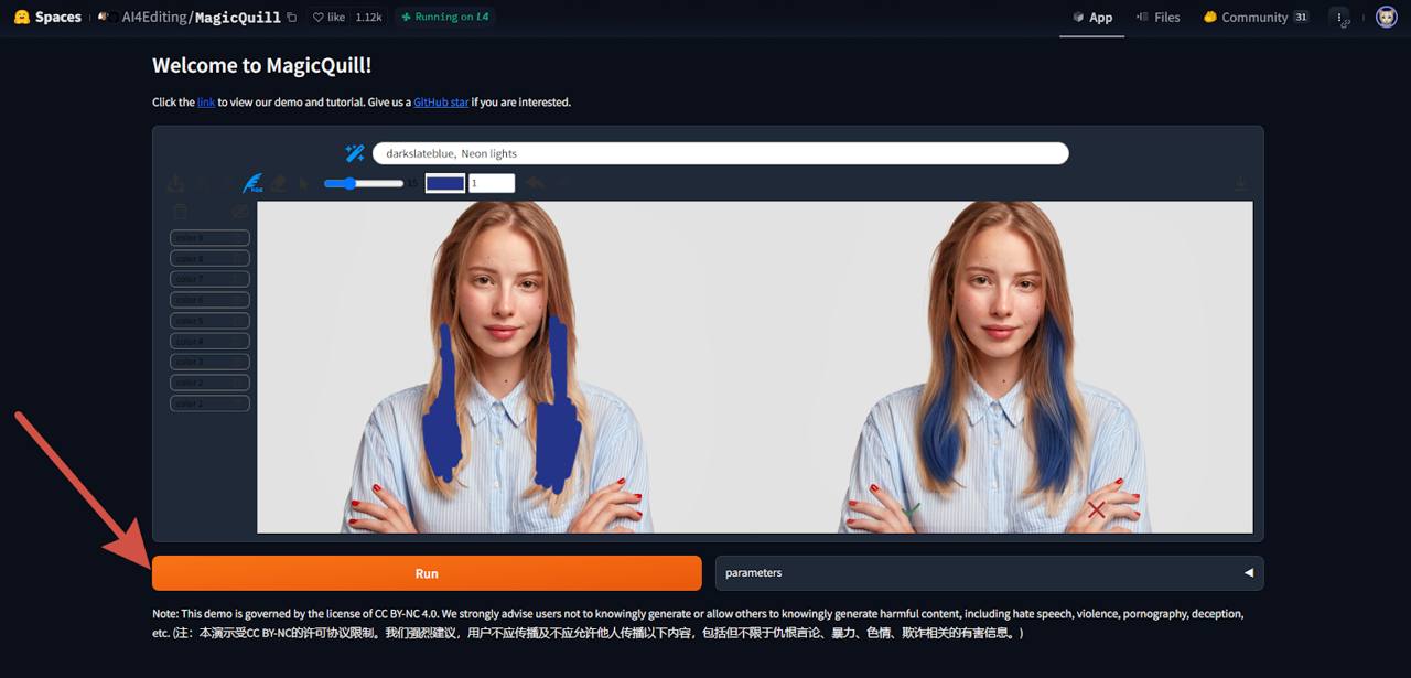 Переходим в MagicQuill и загружаем фотографию. Затем выбираем нужную кисть, например, с цветом. Раскрашиваем то, что хотим изменить на фото, а после нажимаем на кнопку «Run».